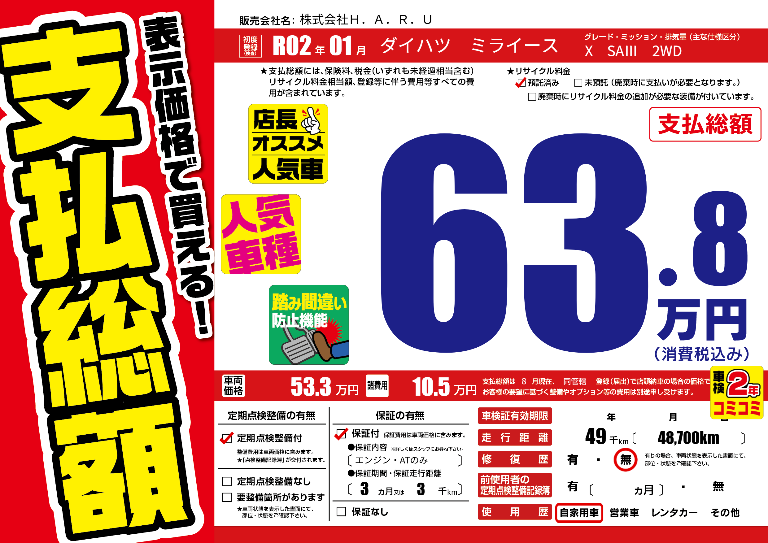 | 走行キロ | 4.9万km | 初年度登録 | R02年01月 |
