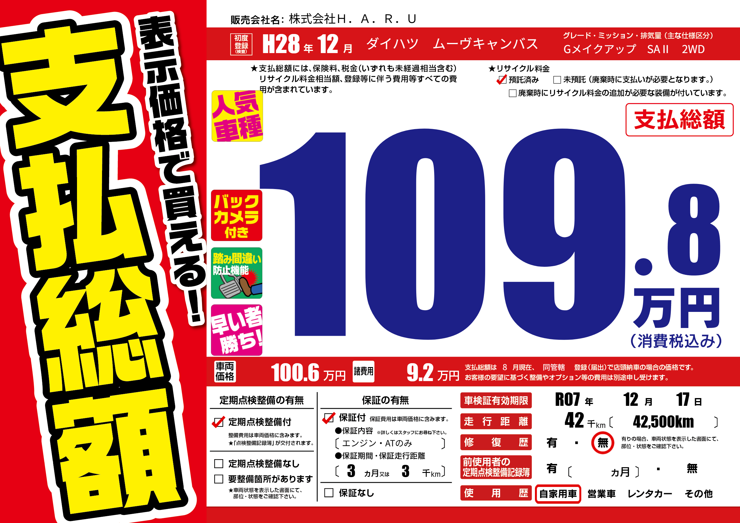保証付き 保証内容(エンジン・ATのみ) 3ヶ月または(3)千kmまで |