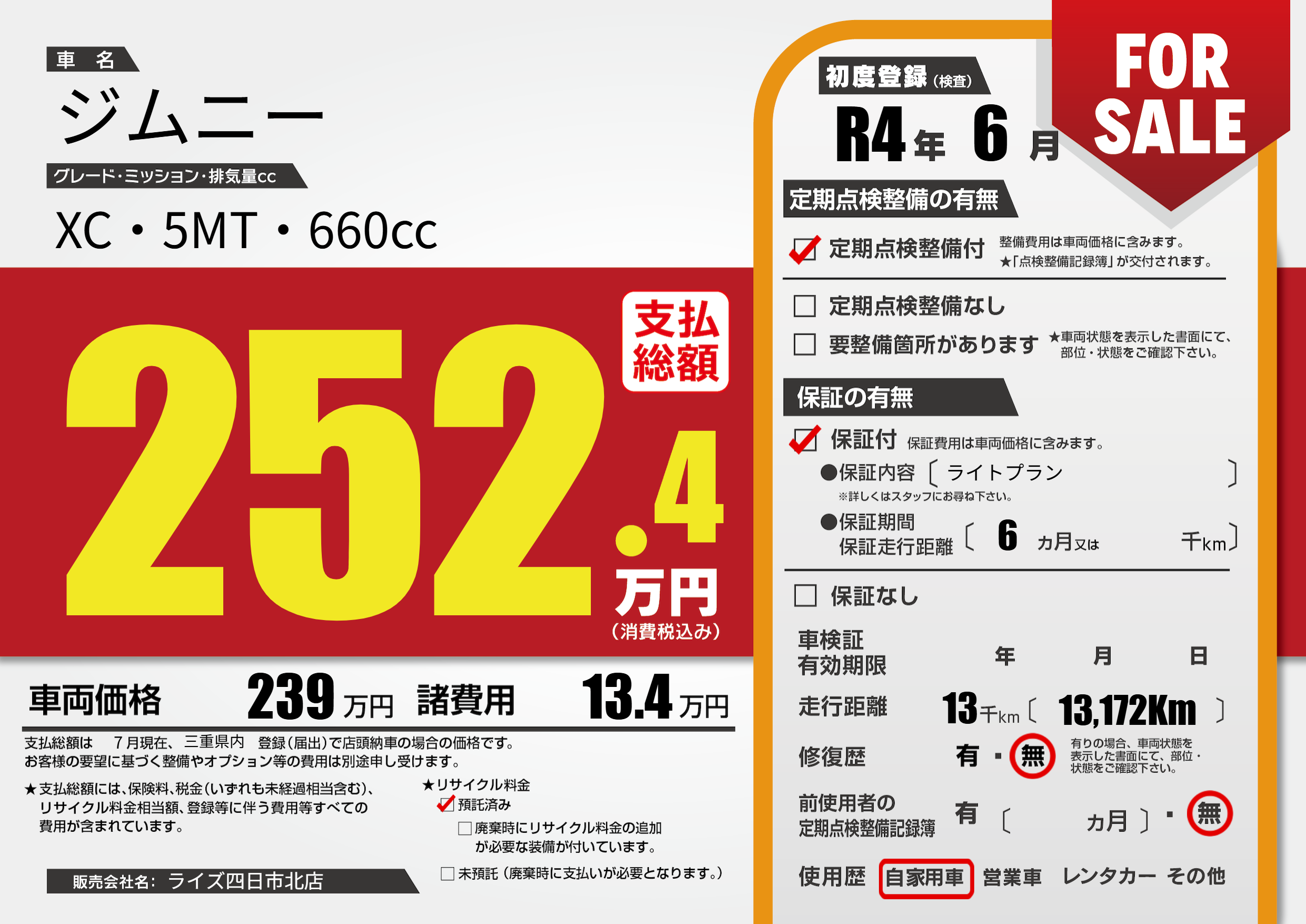 | 車名 | ジムニー | グレード ミッション 排気量 |