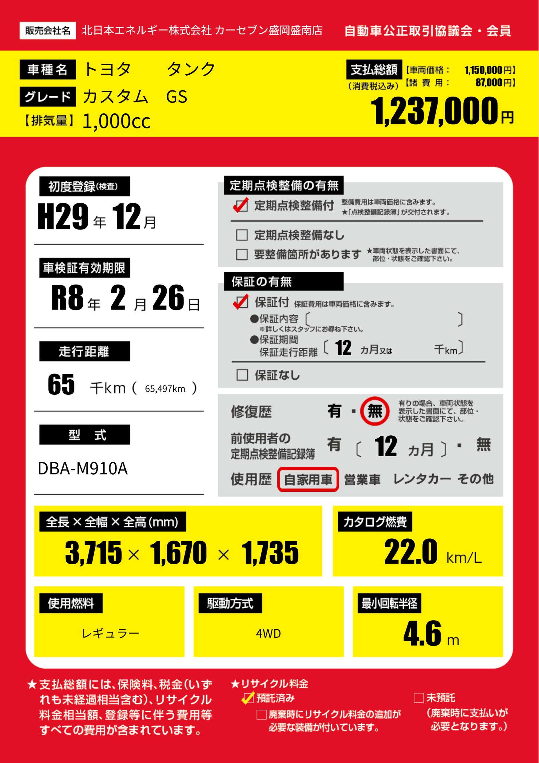 | 車名 | トヨタ タンク | グレード ミッション 排気量 |
