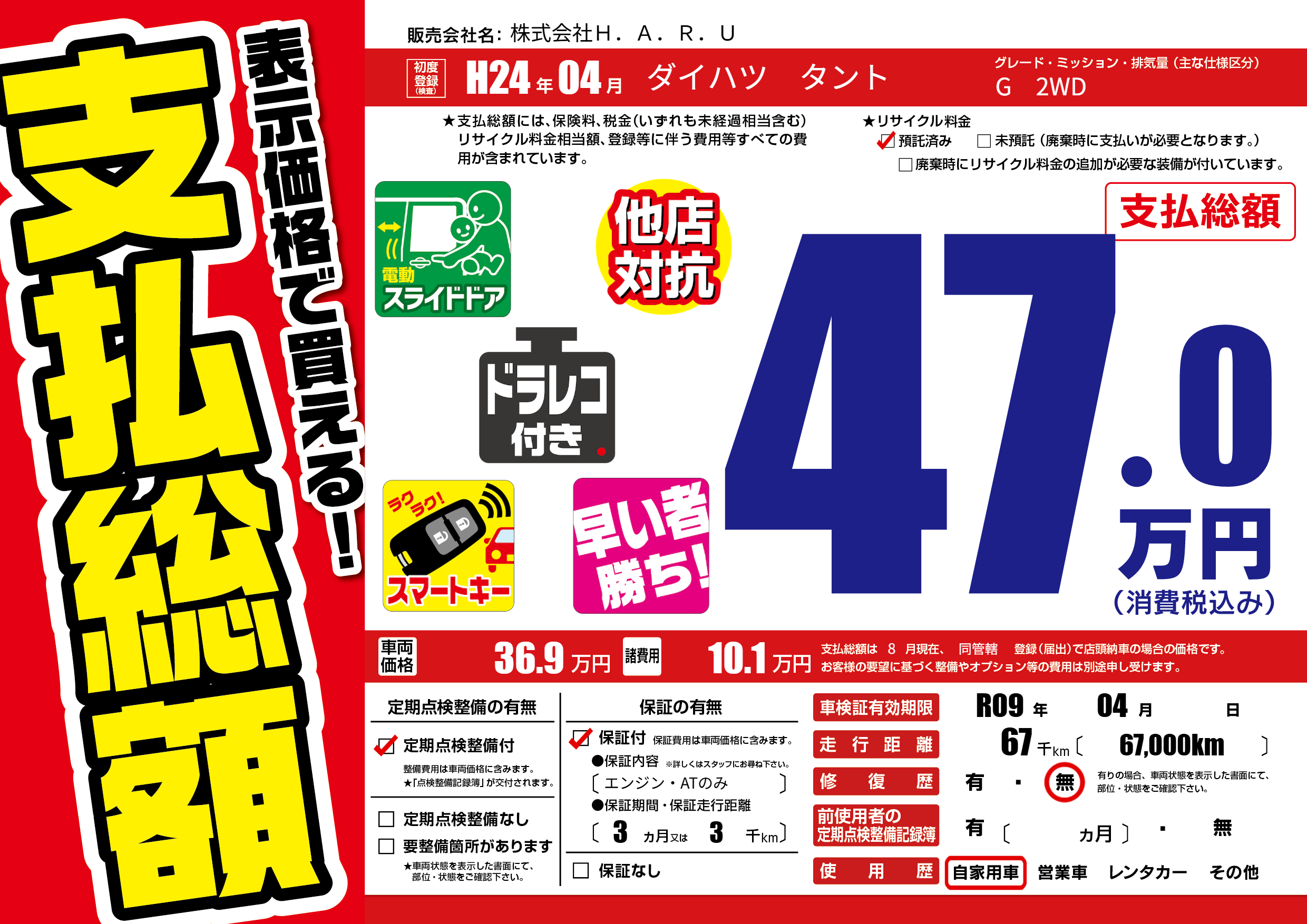 | 走行キロ | 6.7万km | 初年度登録 | H24年04月 |
