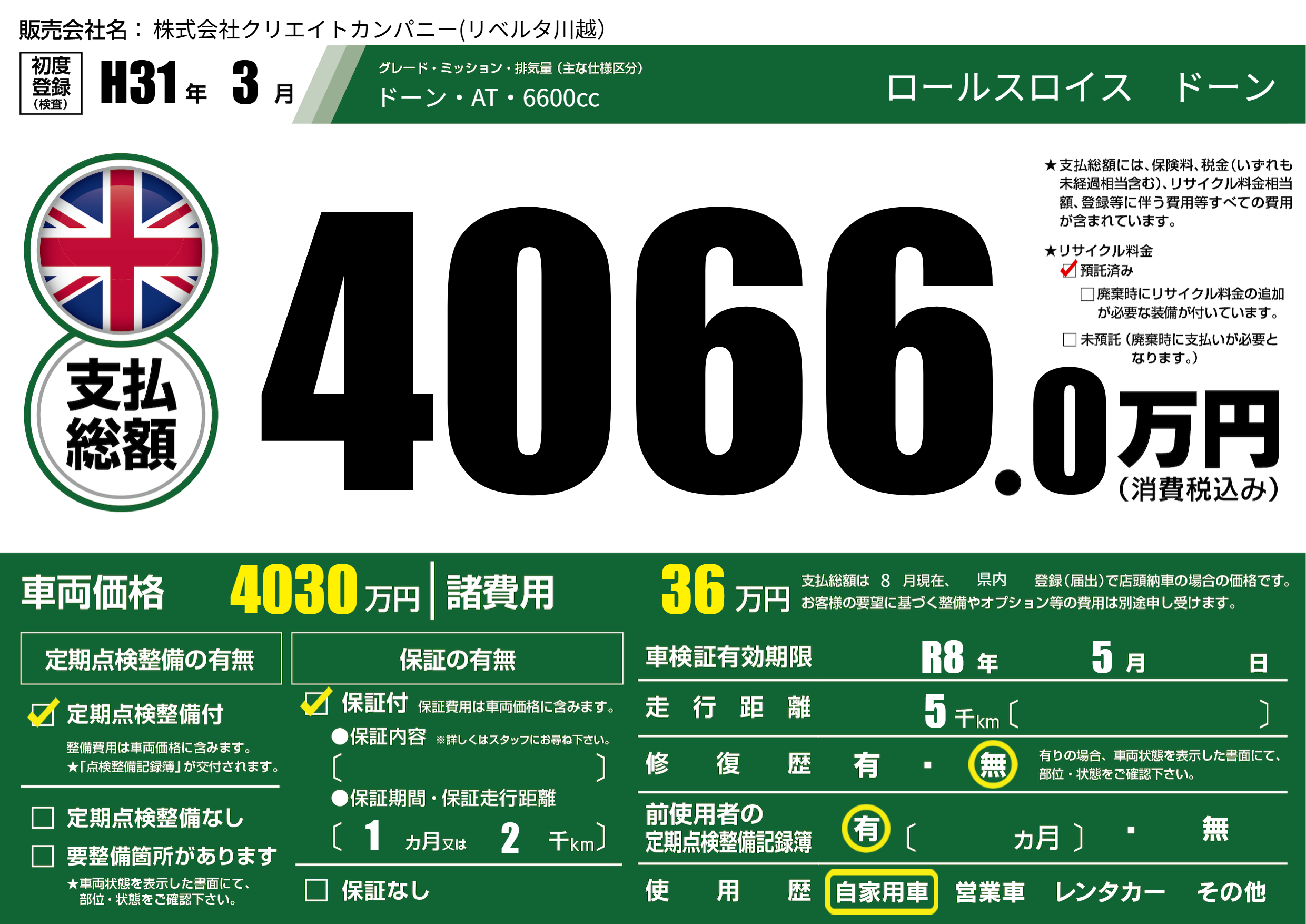 | 車名 | ロールスロイス ドーン | グレード ミッション 排気量 |