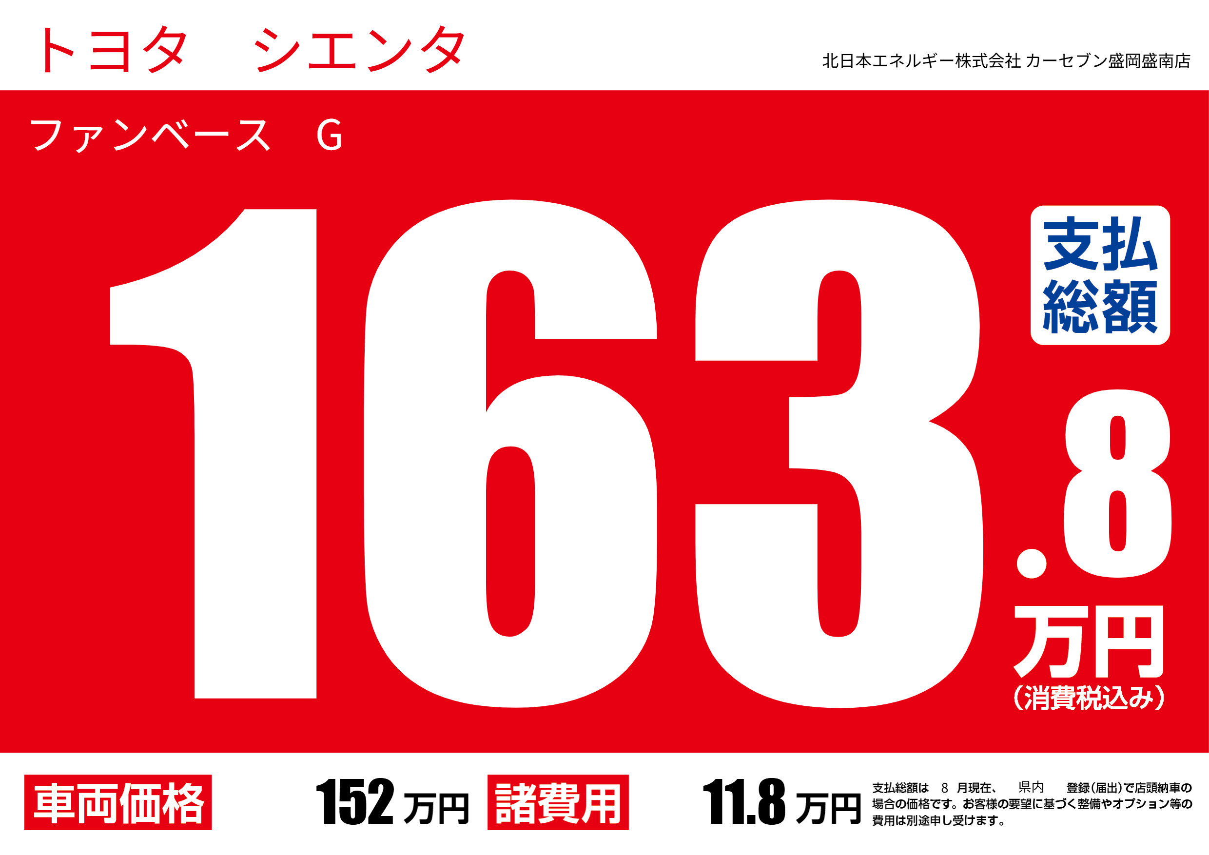 | 車名 | トヨタ シエンタ | グレード ミッション 排気量 |