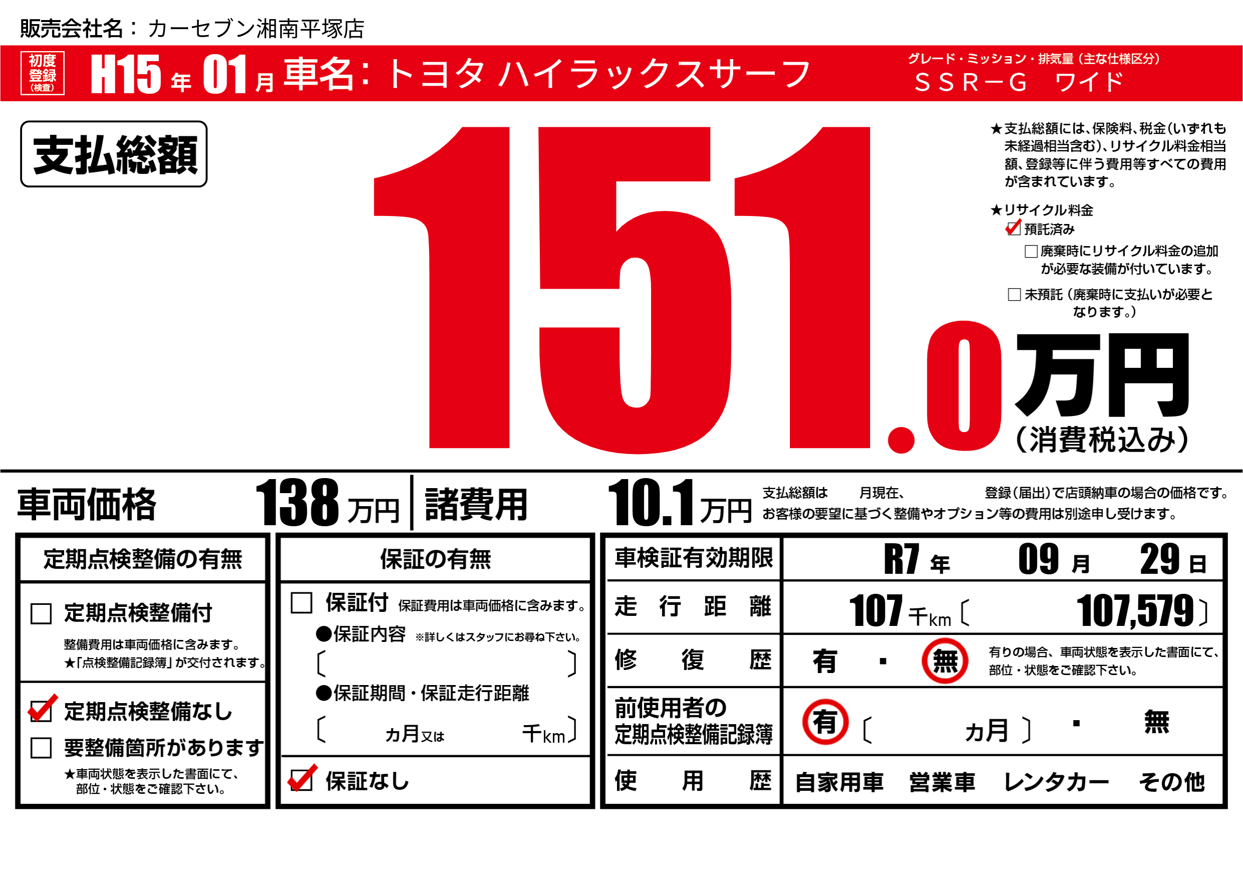 | 走行キロ | 10.7万km | 初年度登録 | H15年01月 |