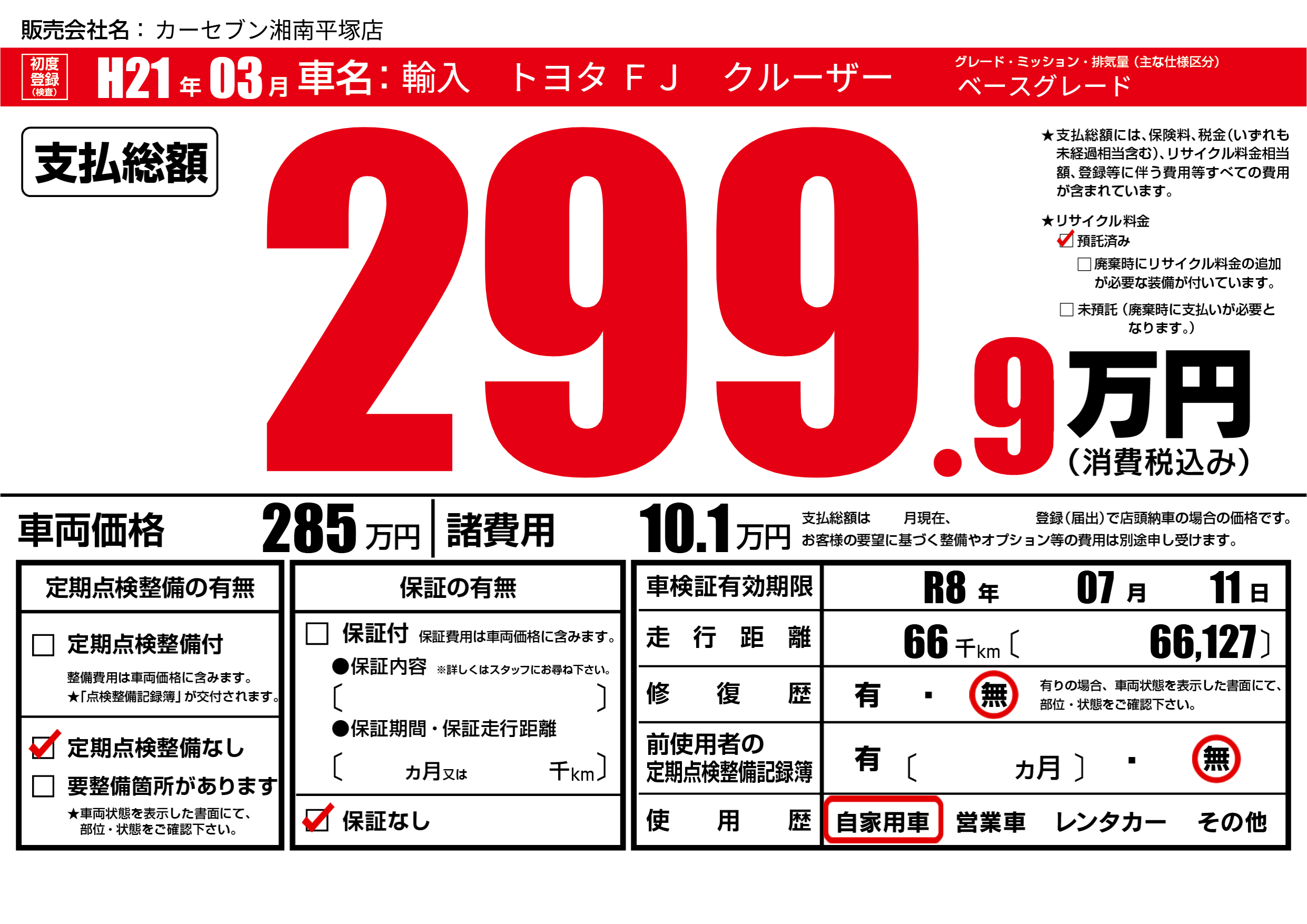 | 車名 | 輸入 トヨタ FJ クルーザー | グレード ミッション 排気量 |