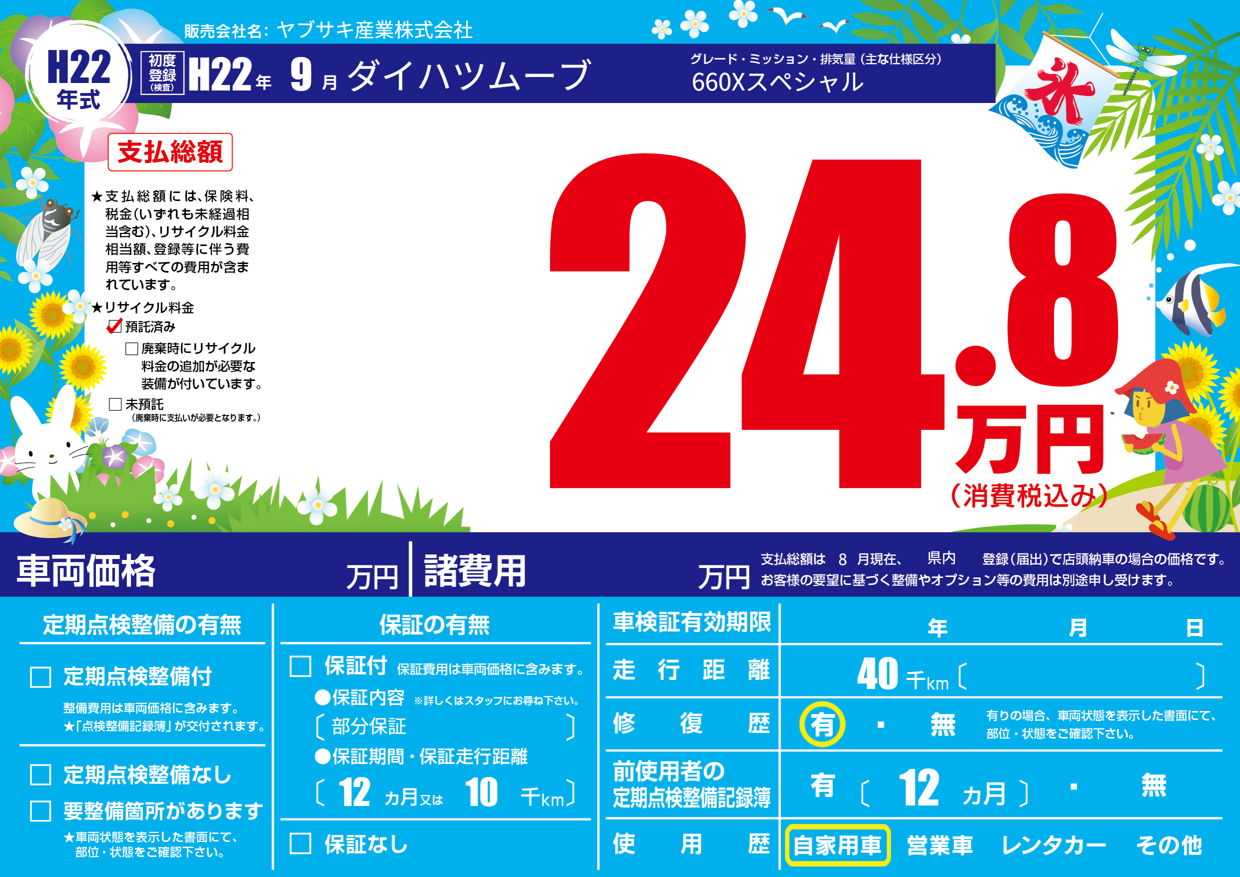| 走行キロ | 4万km | 初年度登録 | H22年9月 |