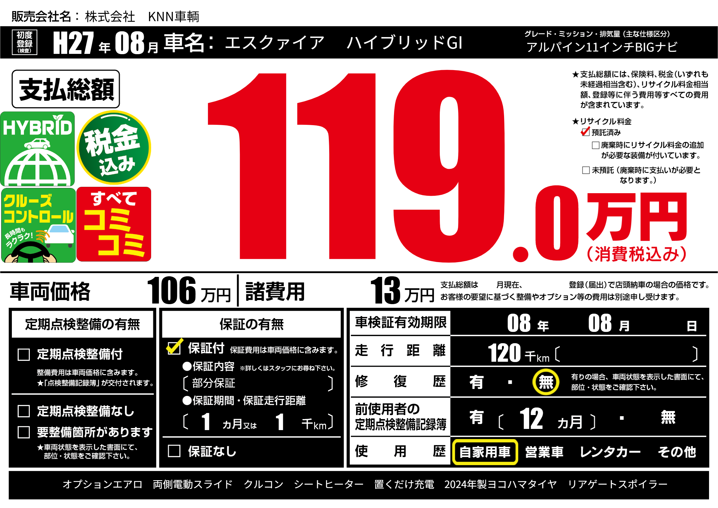 | 走行キロ | 12万km | 初年度登録 | H27年08月 |