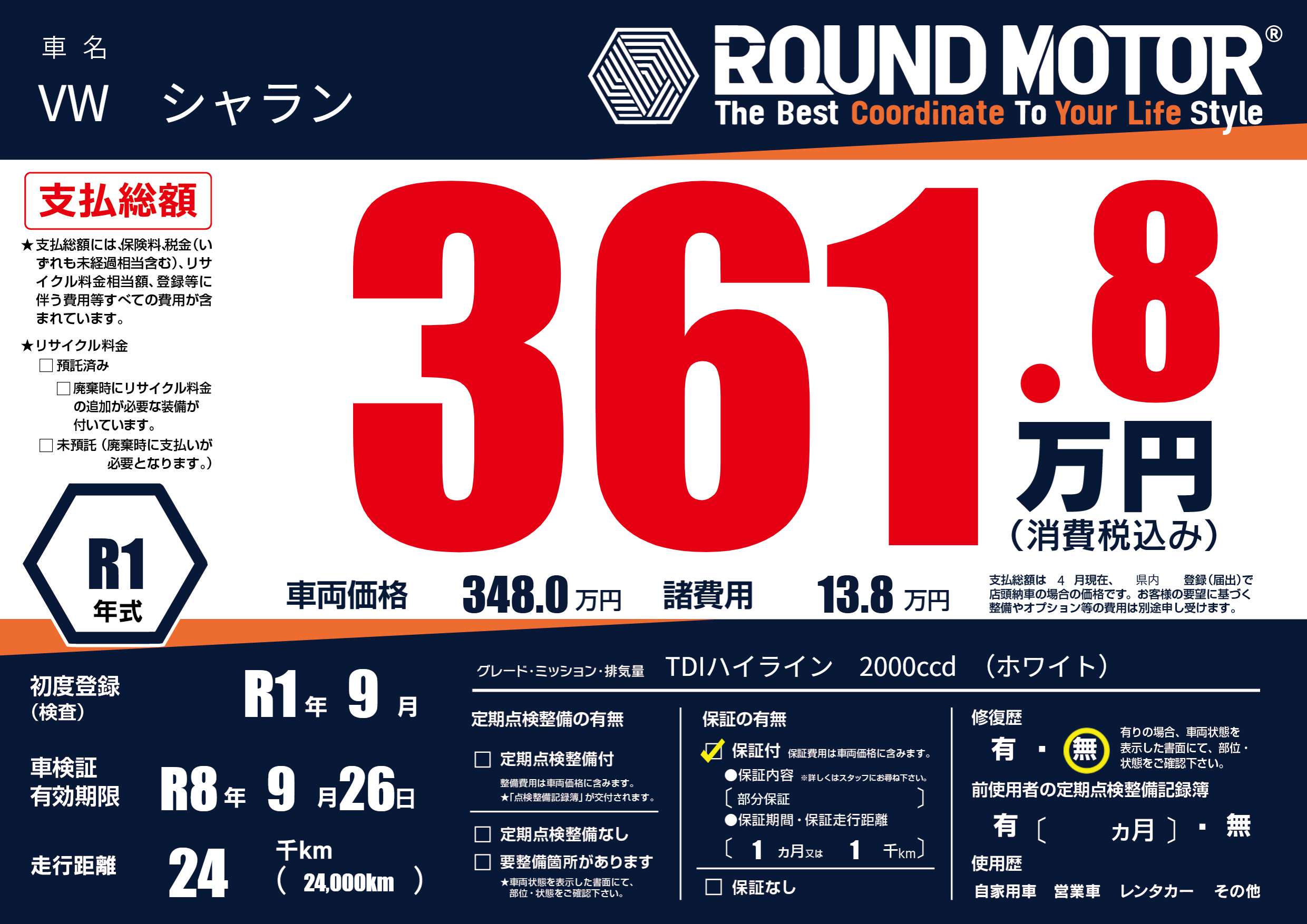 | 車名 | VW シャラン | グレード ミッション 排気量 |