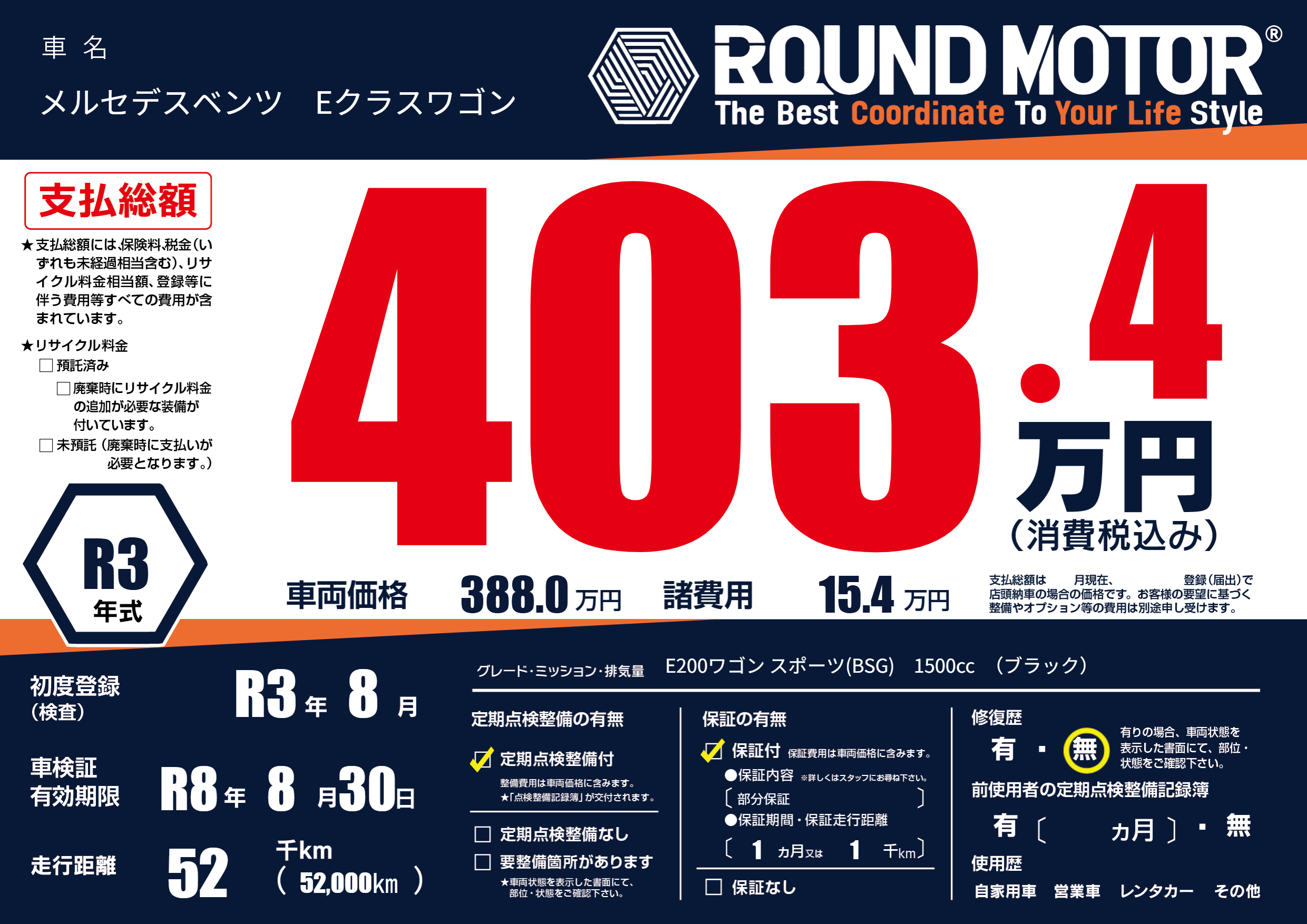 | 車名 | メルセデスベンツ Eクラスワゴン | グレード ミッション 排気量 |