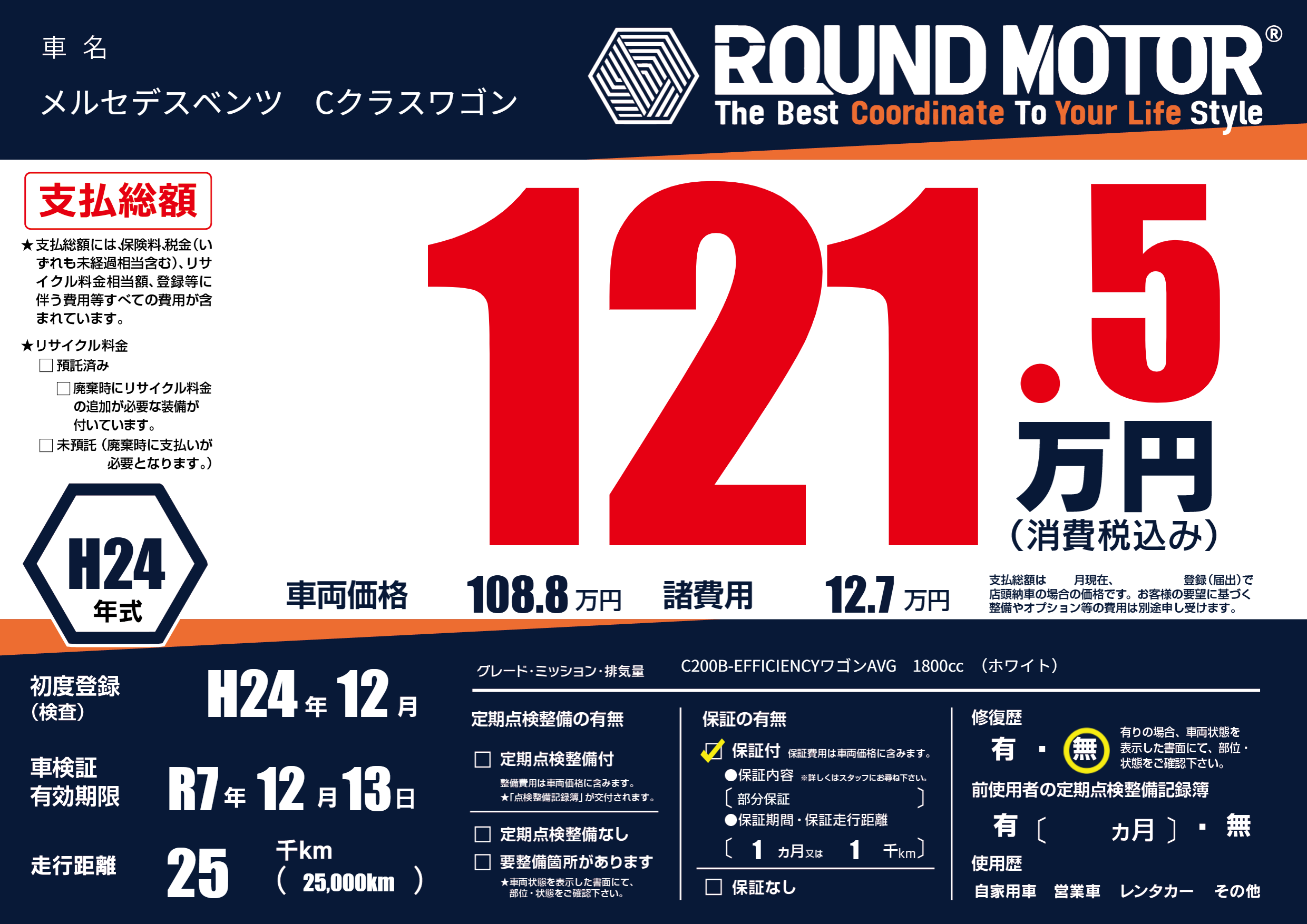 | 車名 | メルセデスベンツ Cクラスワゴン | グレード ミッション 排気量 |