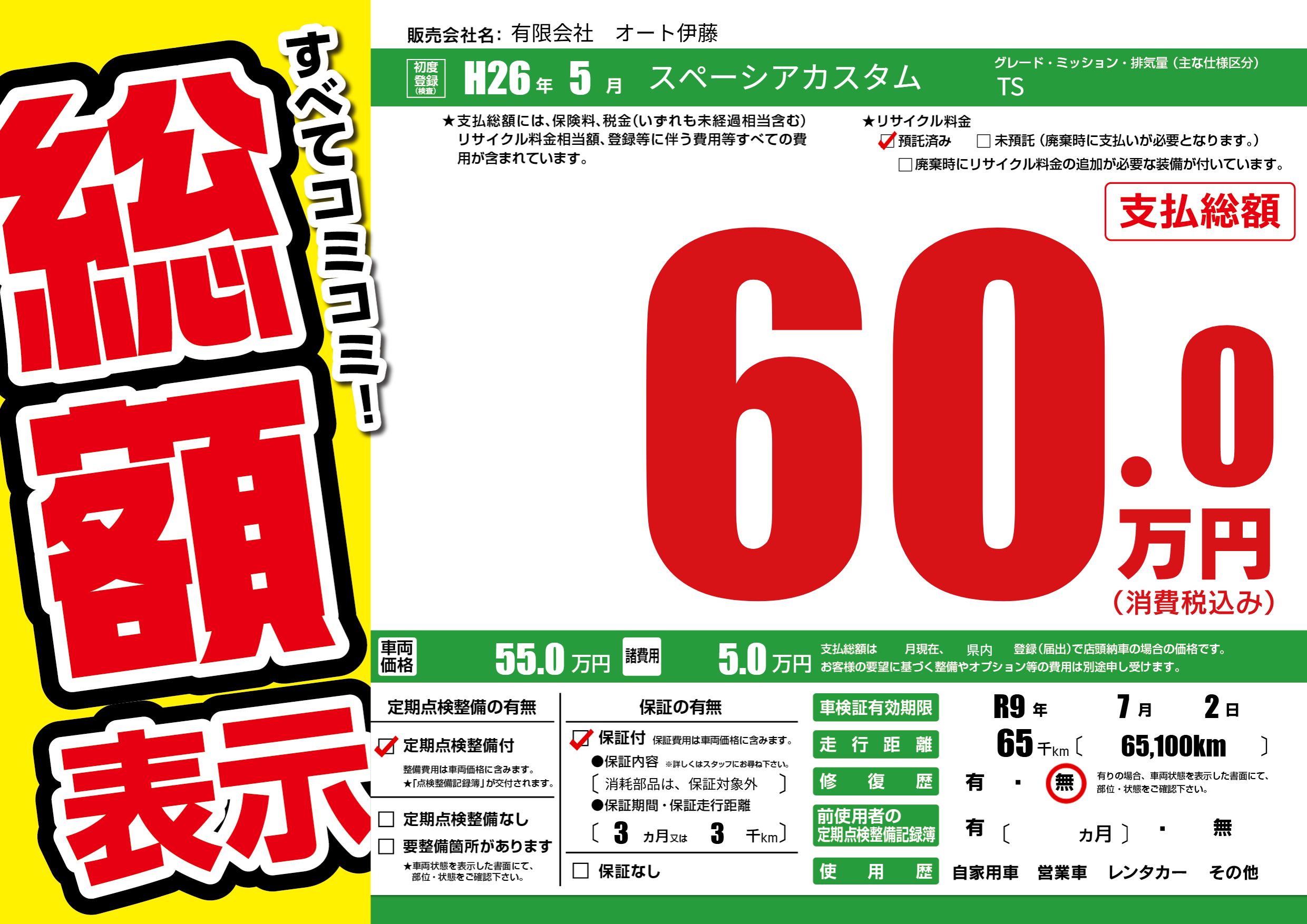 | 車名 | スペーシアカスタム | グレード ミッション 排気量 |