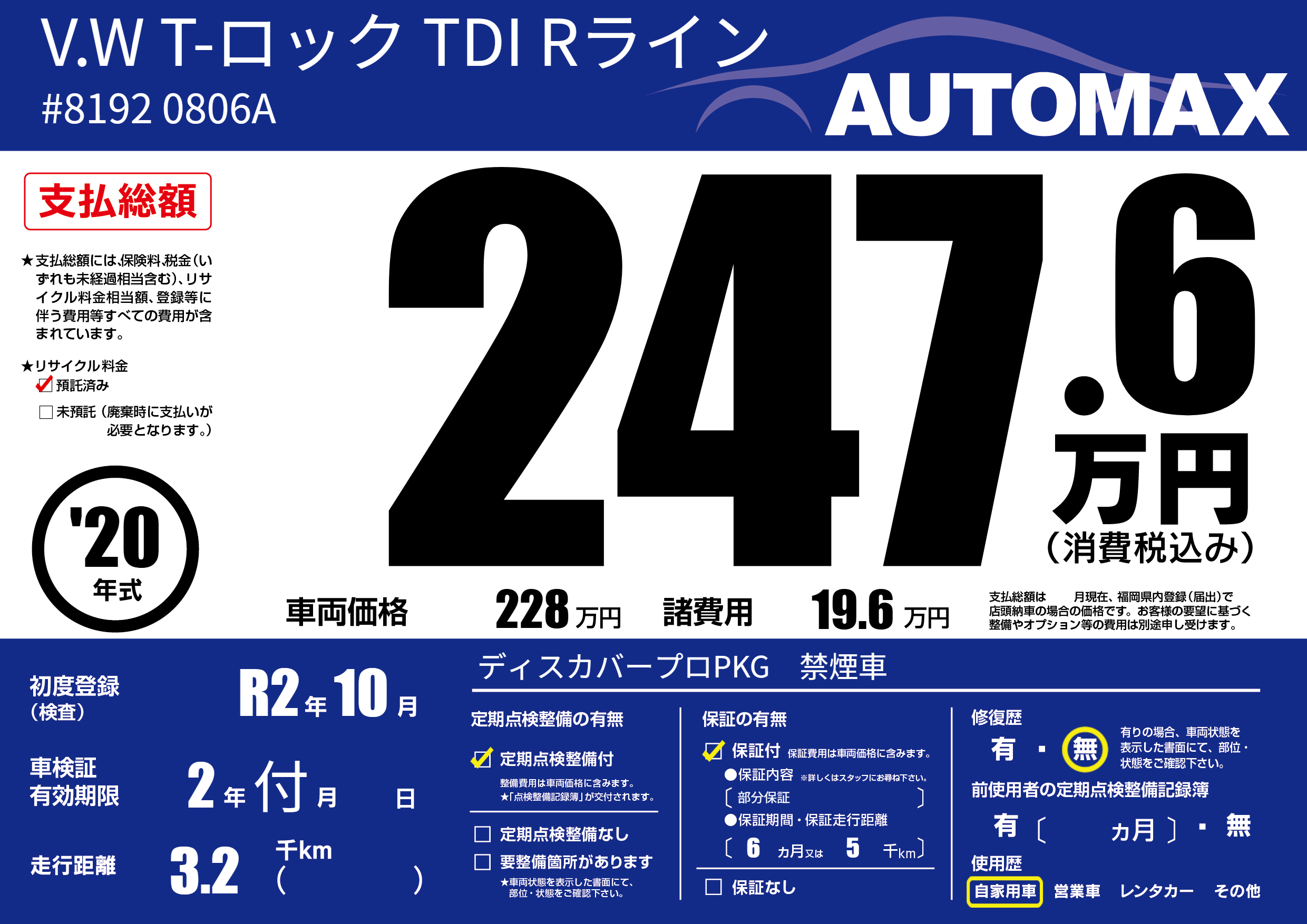 | 車名 | V.W T-ロック TDI Rライン | グレード ミッション 排気量 |