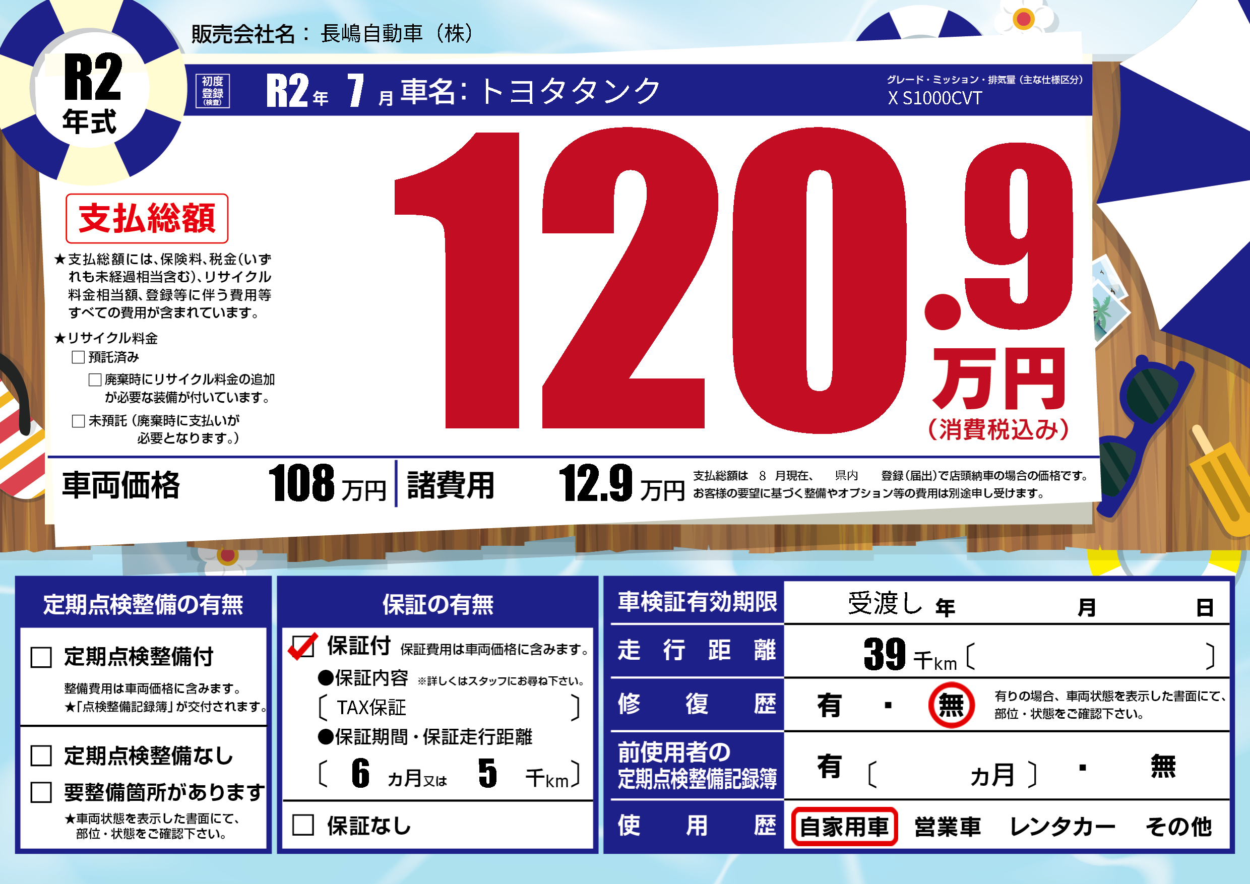 保証付き 保証内容(TAX保証) 6ヶ月または(5)千kmまで |