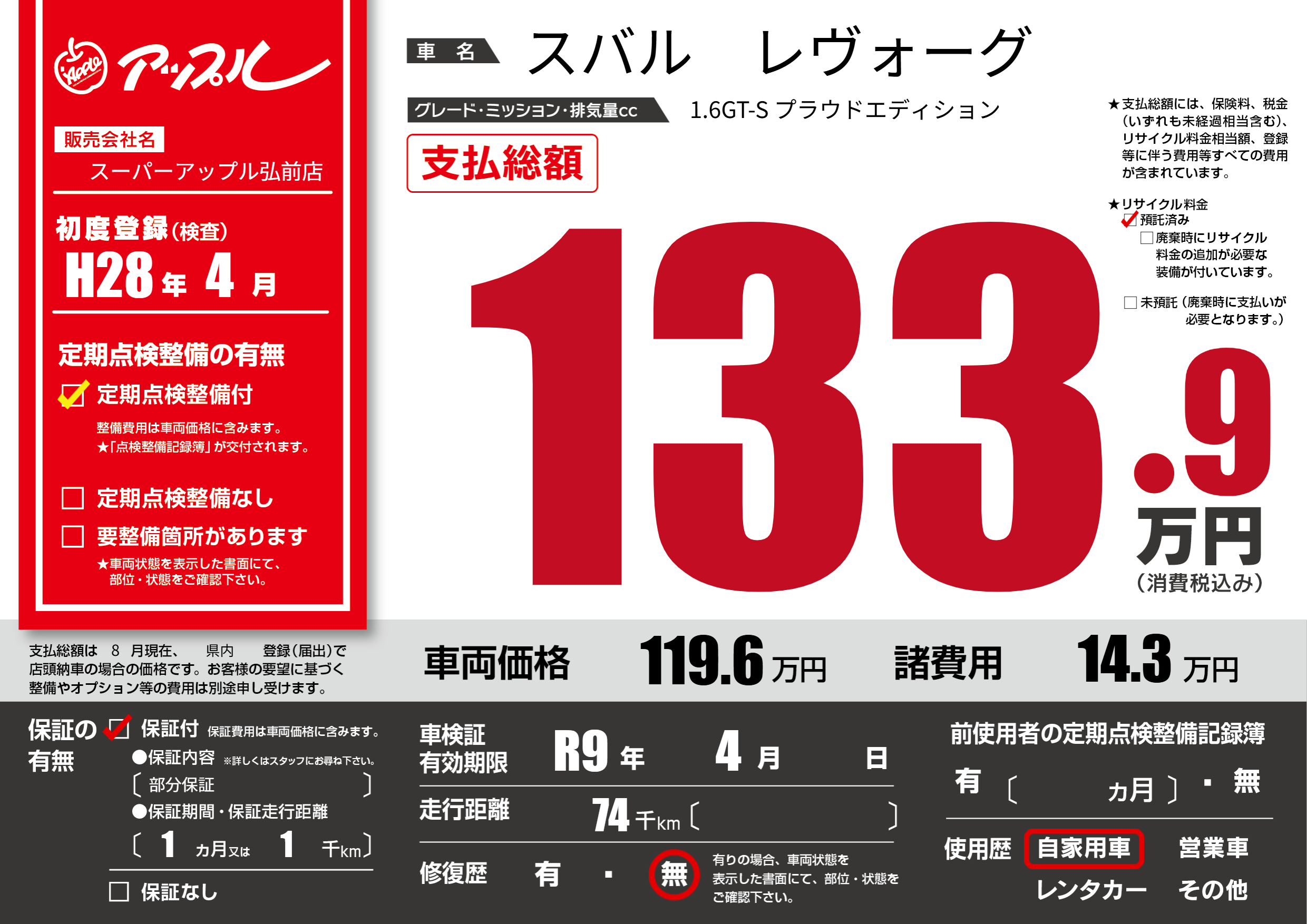 | 車名 | スバル レヴォーグ | グレード ミッション 排気量 |