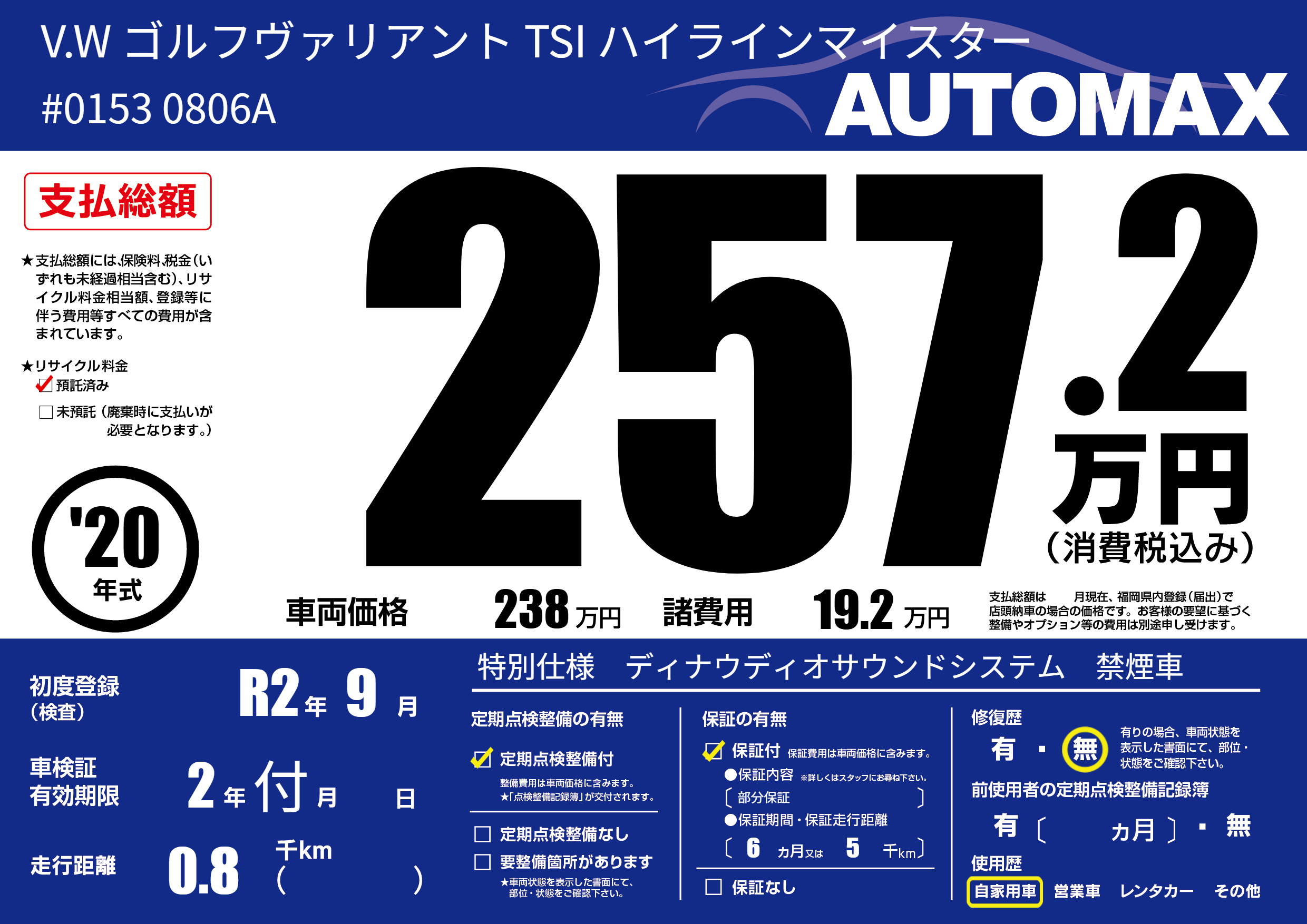 | 車名 | V.W ゴルフヴァリアント TSI ハイラインマイスター | グレード ミッション 排気量 |