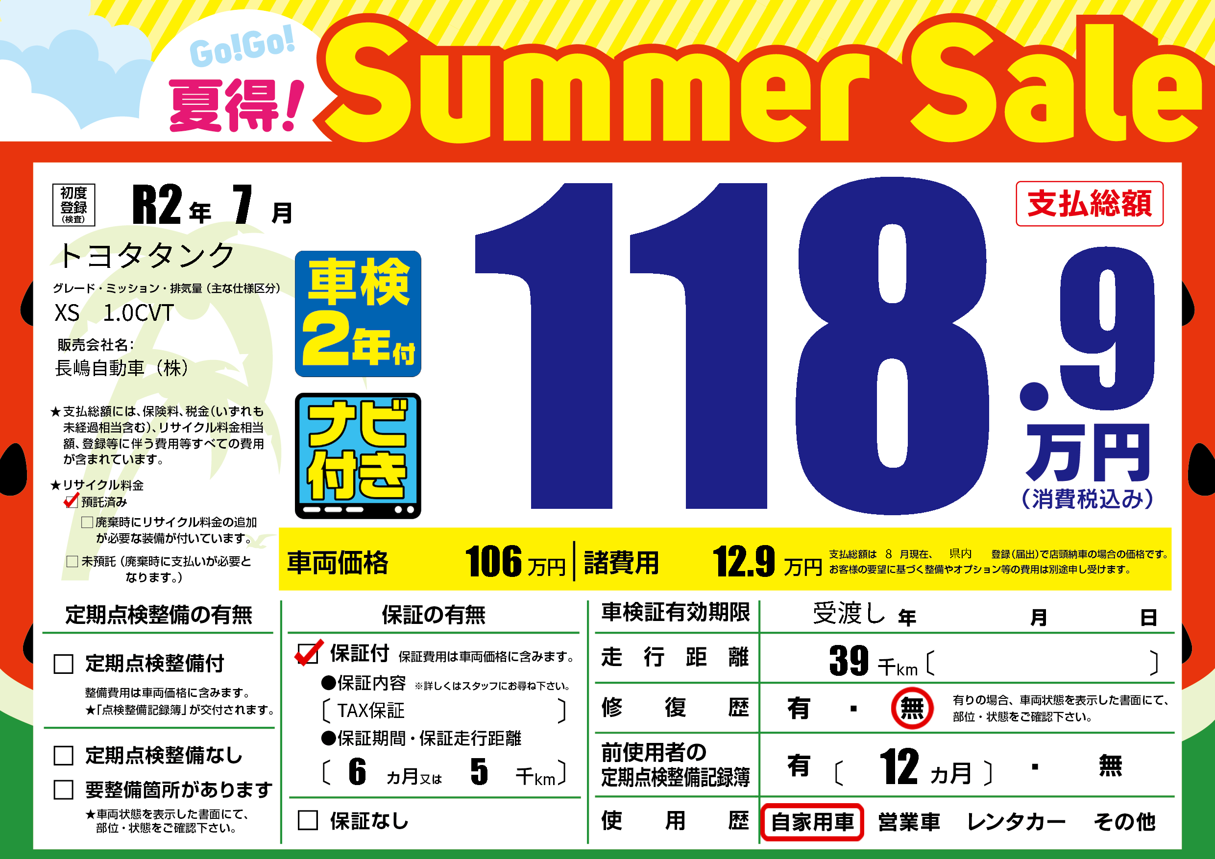 保証付き 保証内容(TAX保証) 6ヶ月または(5)千kmまで |