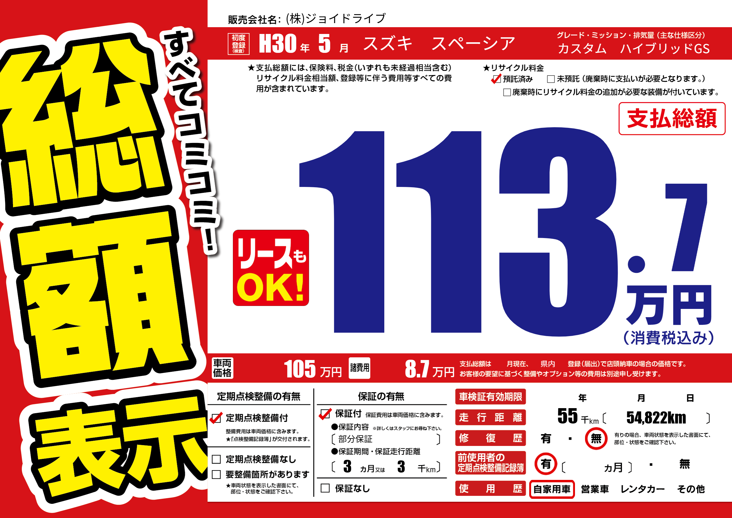 | 走行キロ | 5.5万km | 初年度登録 | H30年5月 |