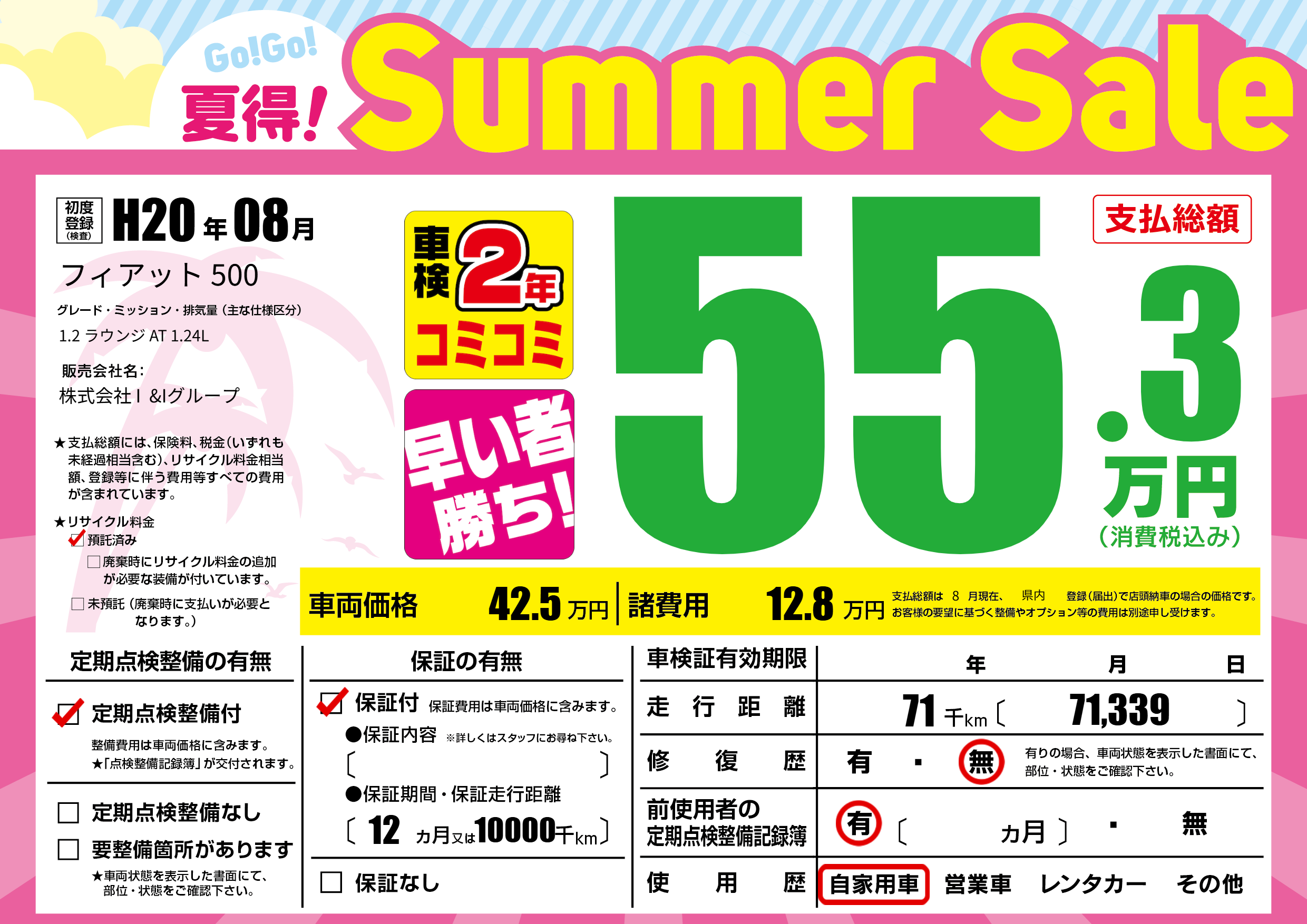 | 車名 | フィアット 500 | グレード ミッション 排気量 |