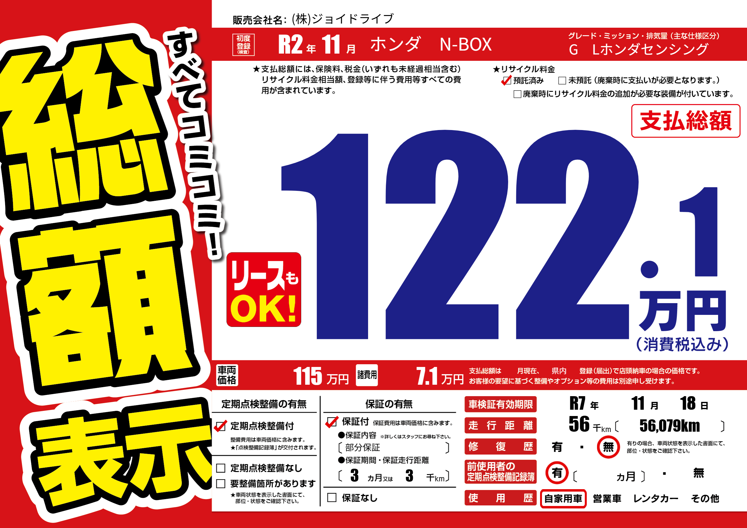 | 車名 | ホンダ N-BOX | グレード ミッション 排気量 |