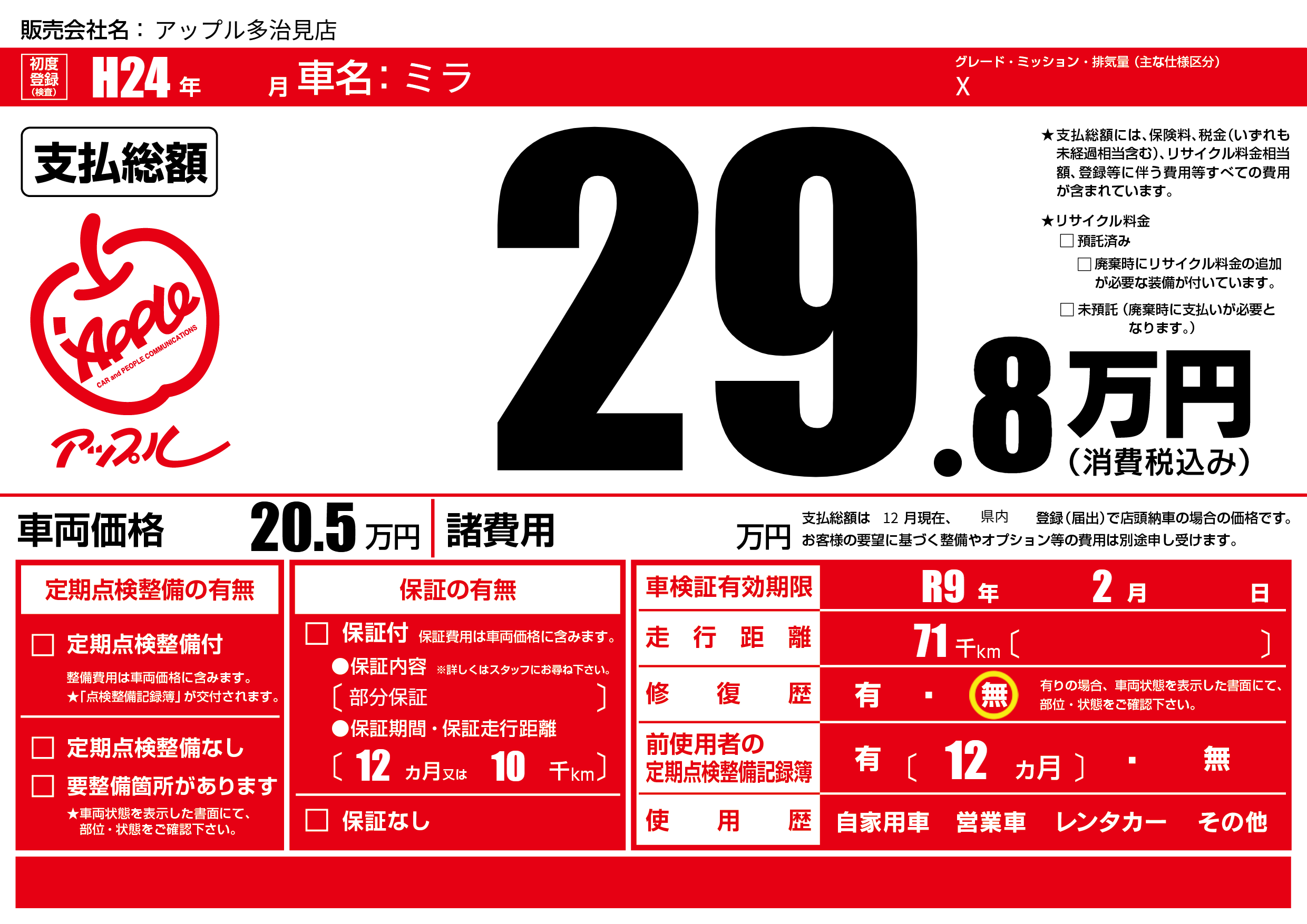 | 車名 | ミラ | グレード ミッション 排気量 |