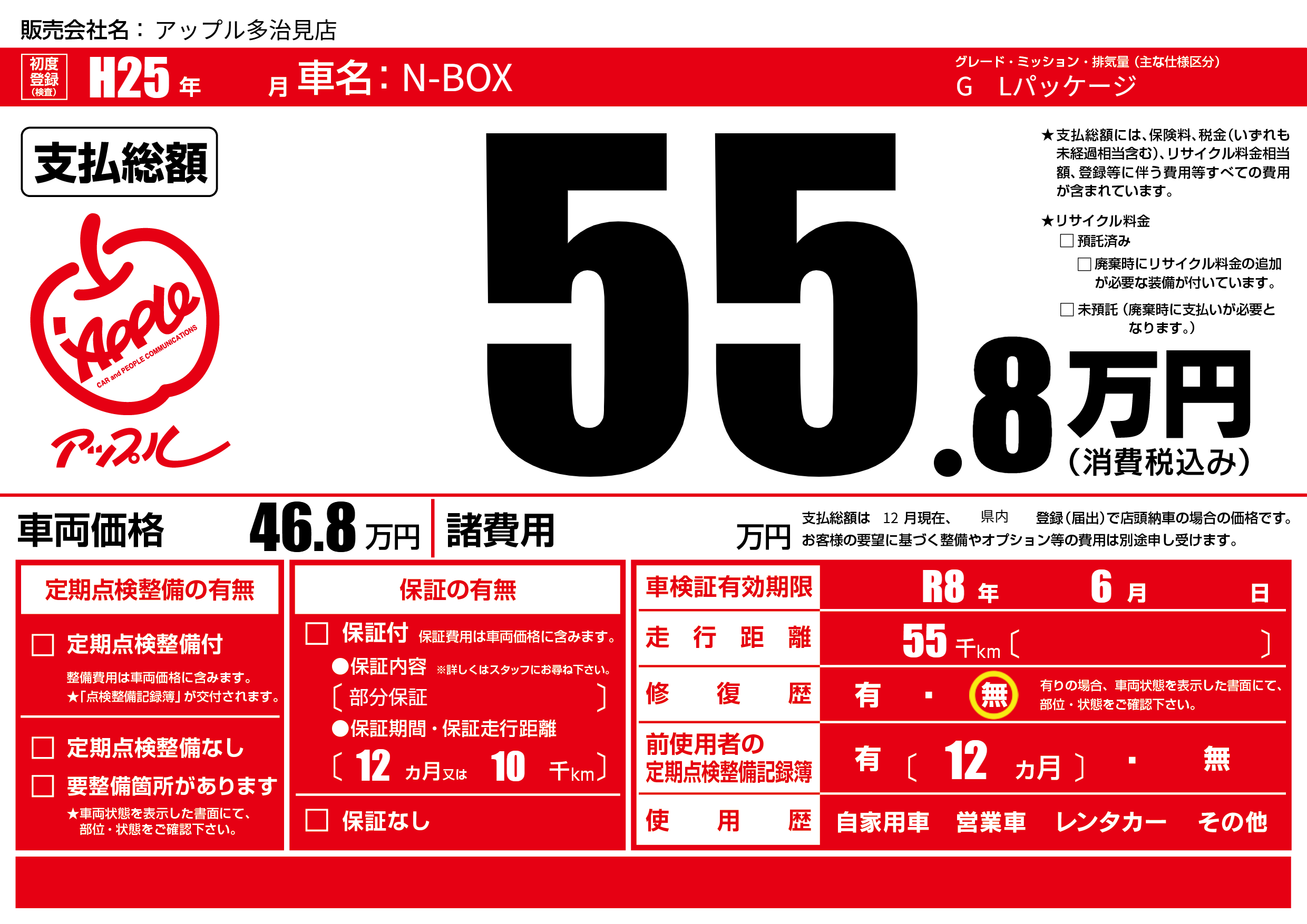 | 車名 | N-BOX | グレード ミッション 排気量 |