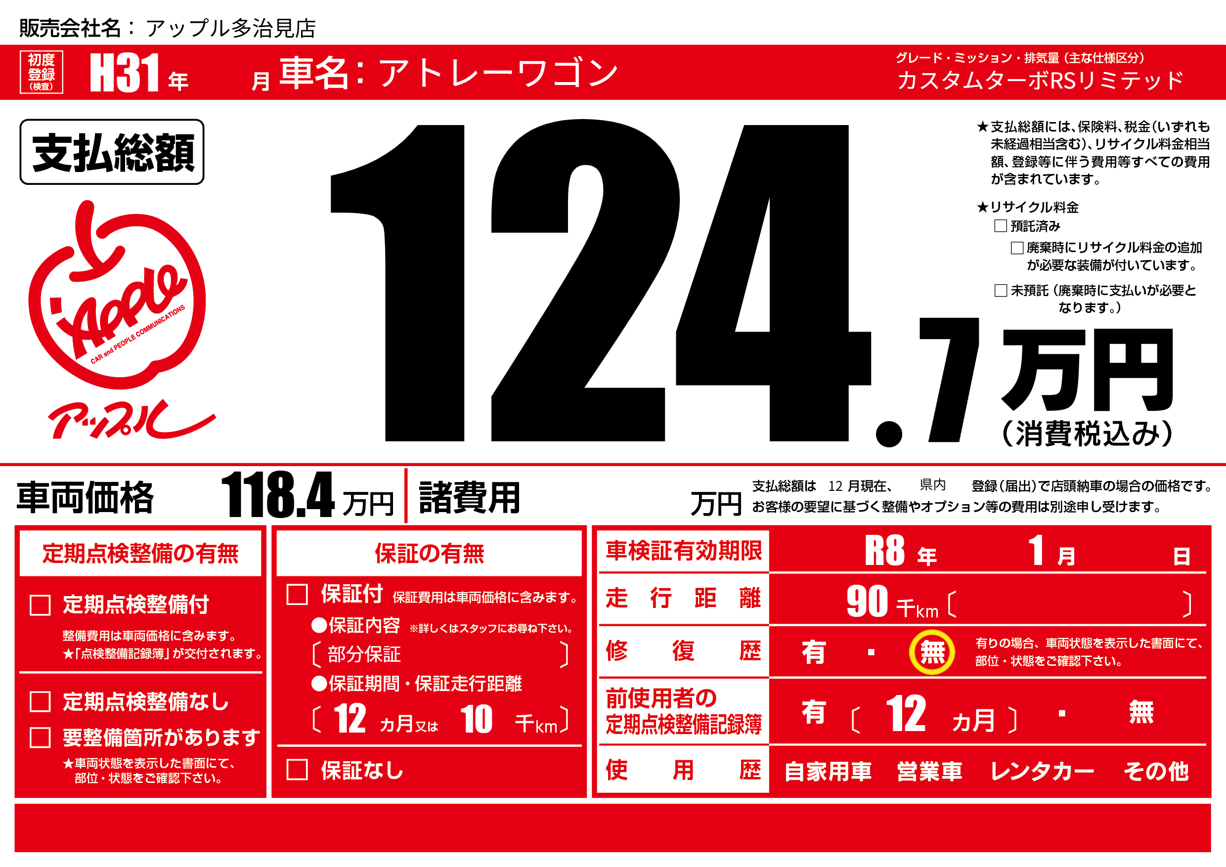 | 車名 | アトレーワゴン | グレード ミッション 排気量 |