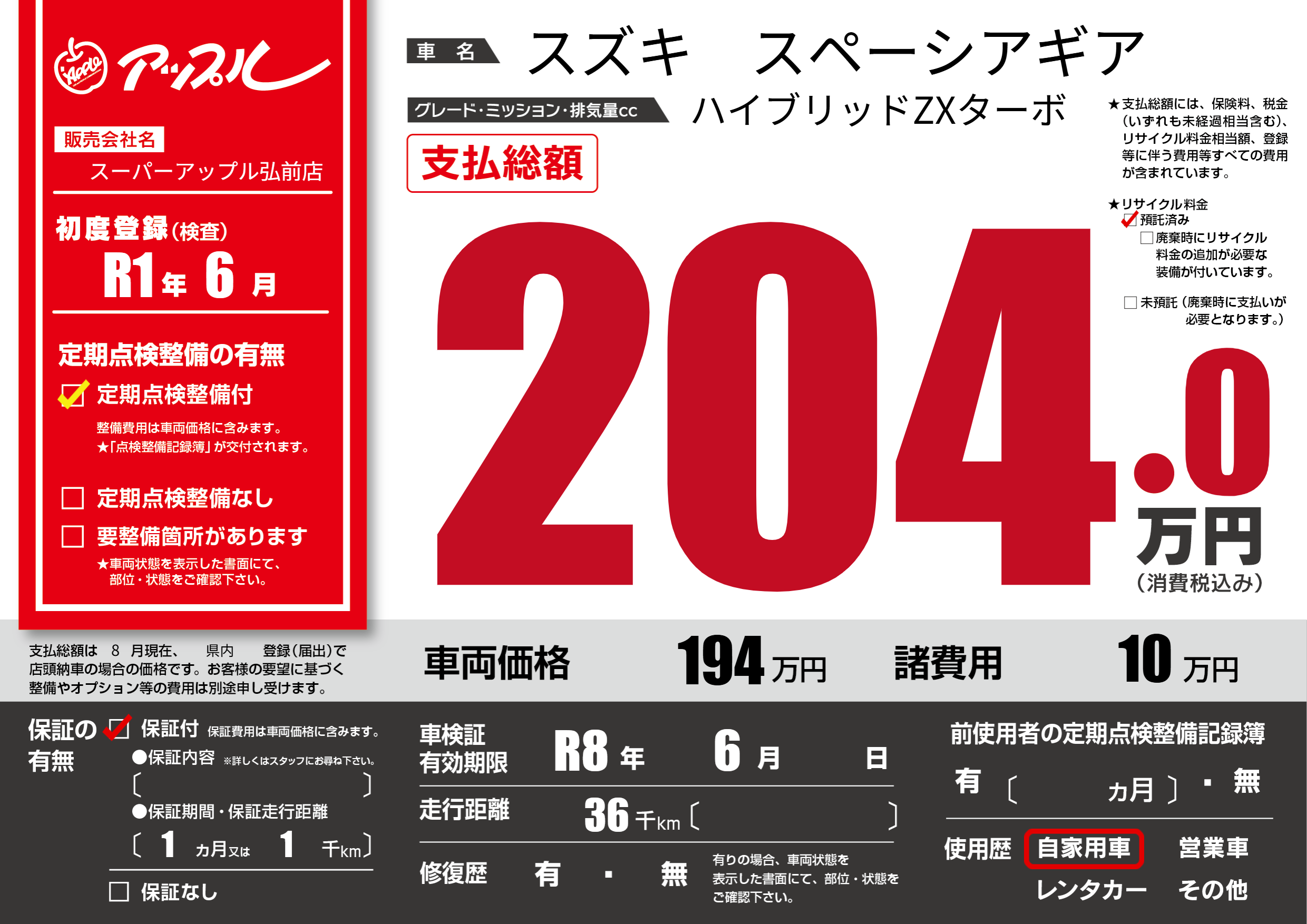 なし | 車検制限 | R8年6月---月 |