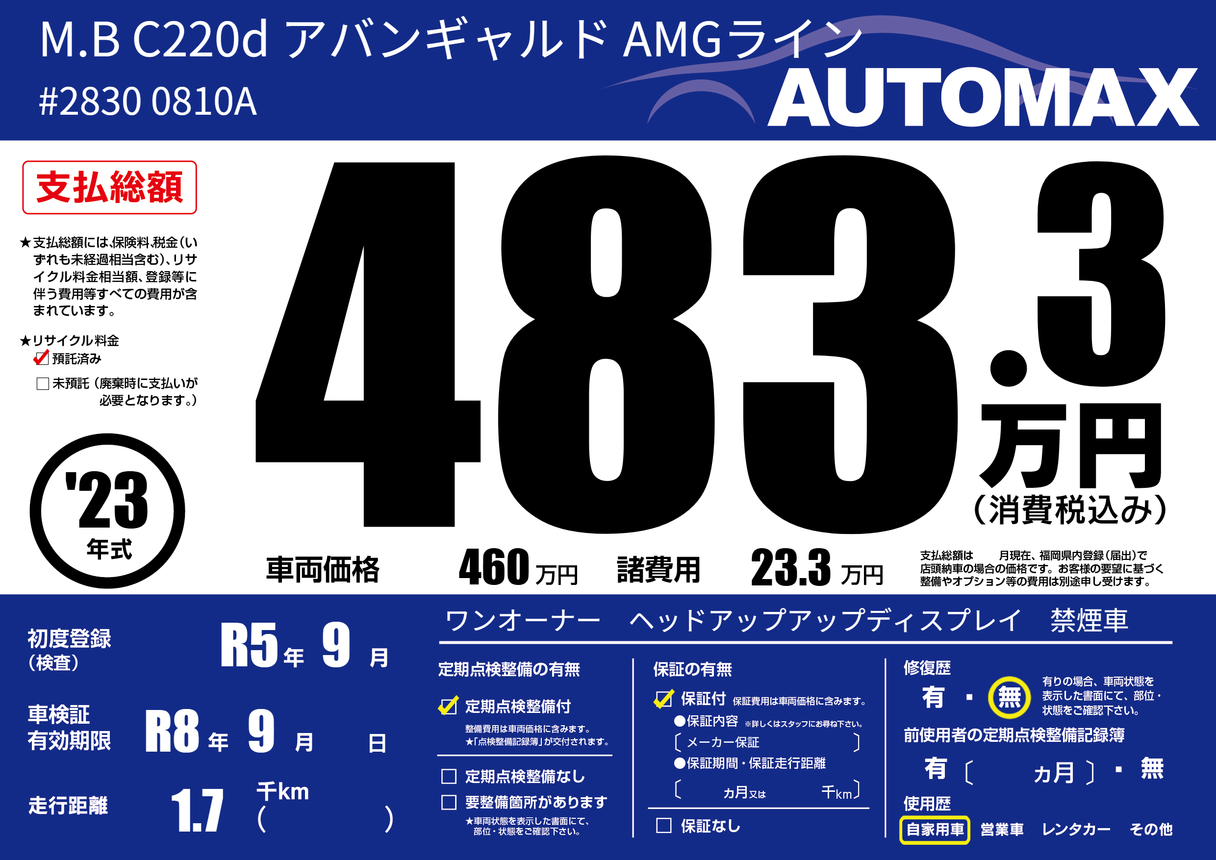 | 車名 | M.B C220d アバンギャルド AMGライン | グレード ミッション 排気量 |