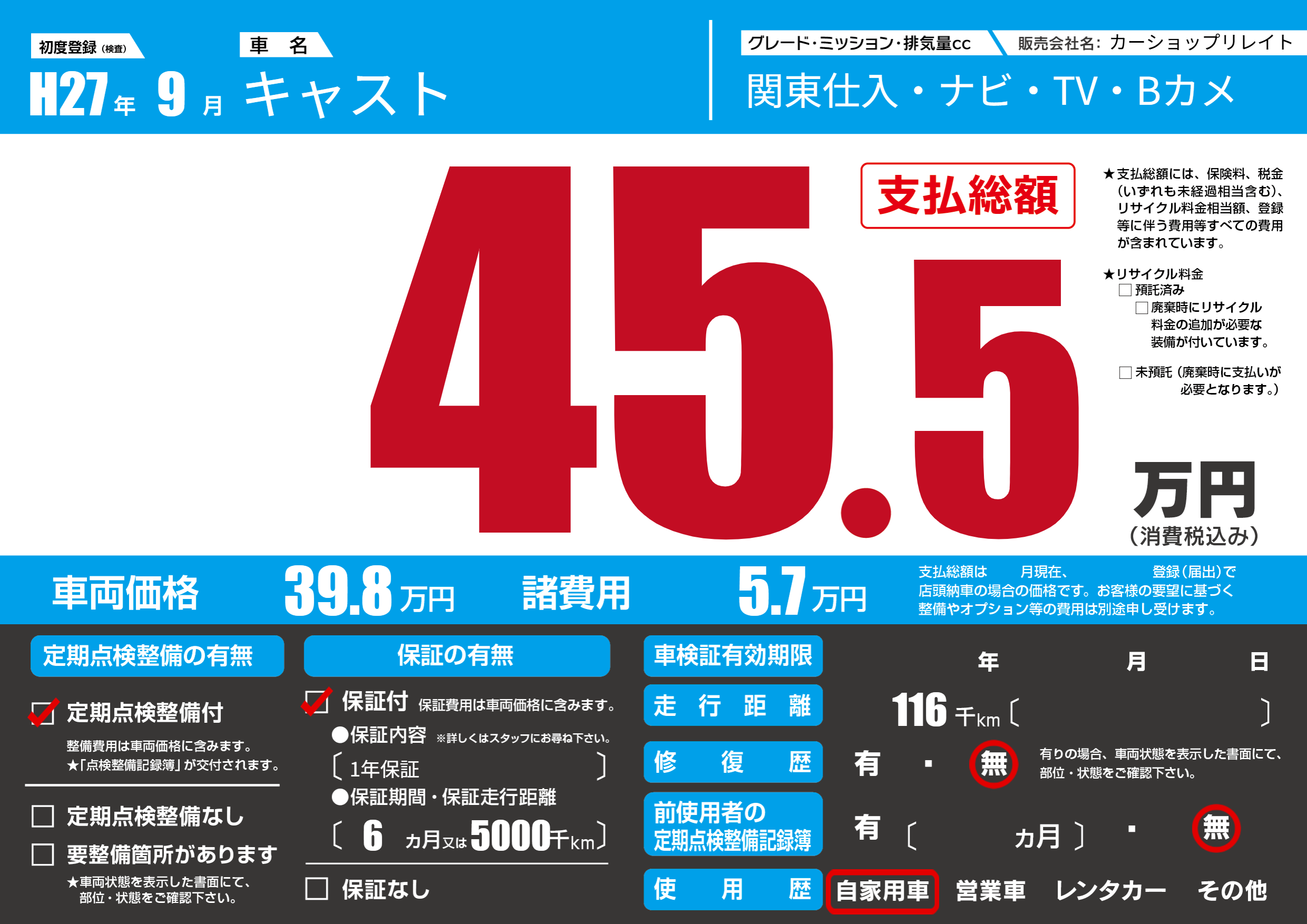 | 走行キロ | 11.6万km | 初年度登録 | H27年9月 |