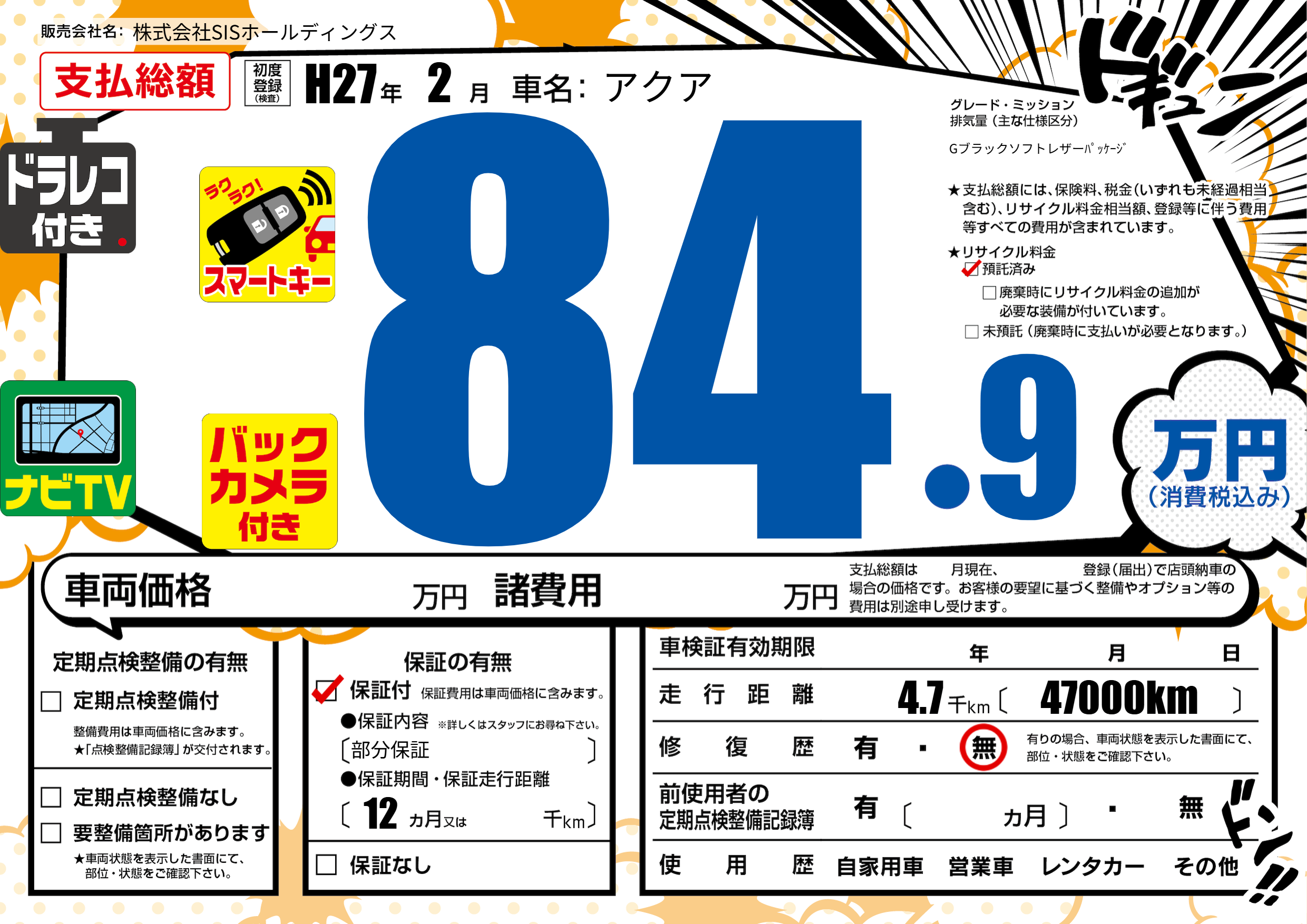 | 走行キロ | 0.4万km | 初年度登録 | H27年2月 |