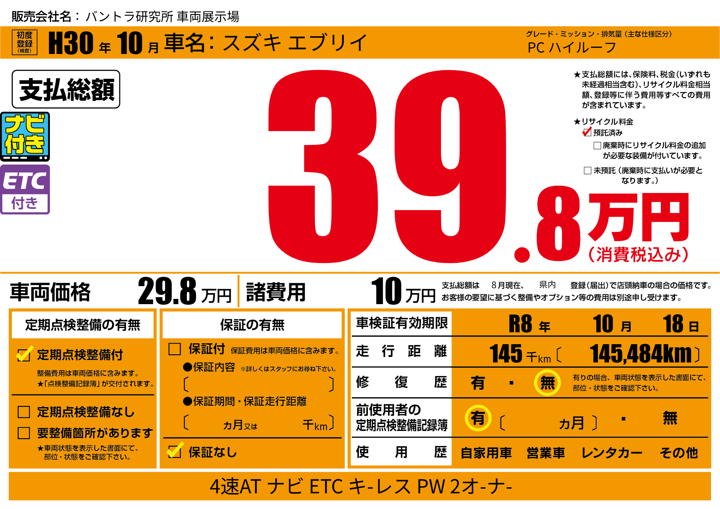 なし | 車検制限 | R8年10月18月 |