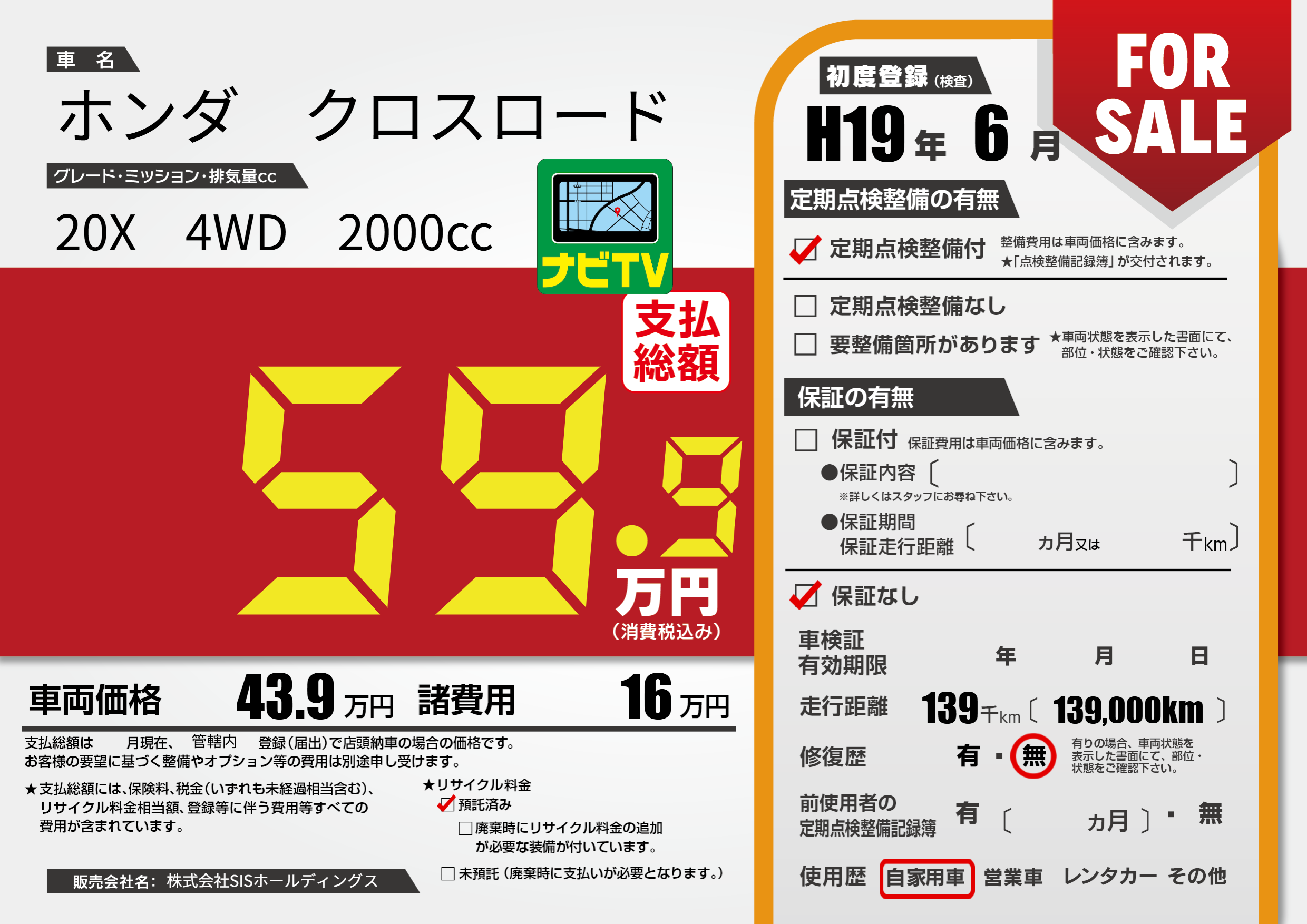 | 走行キロ | 13.9万km | 初年度登録 | H19年6月 |