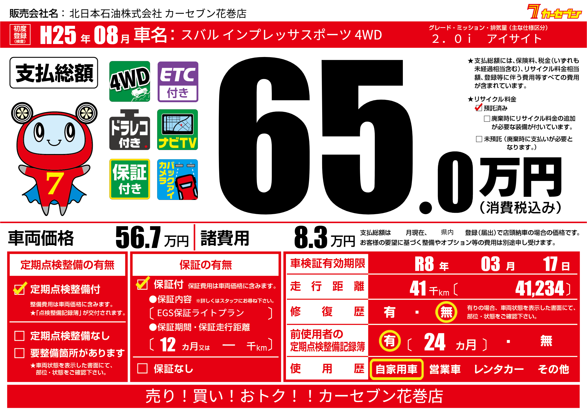 | 車名 | スバル インプレッサスポーツ 4WD | グレード ミッション 排気量 |