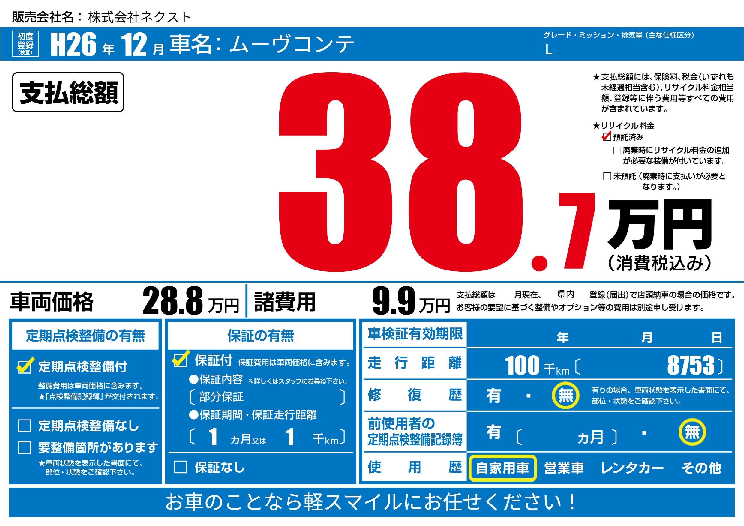 | 走行キロ | 10万km | 初年度登録 | H26年12月 |