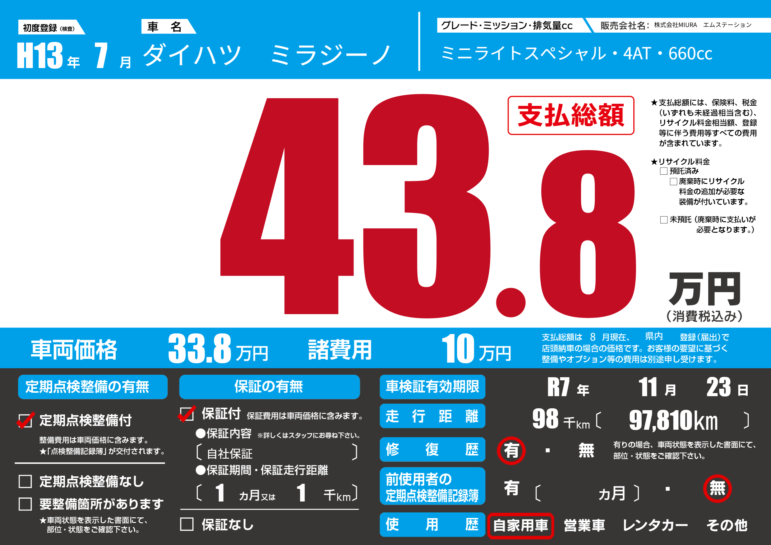 | 車名 | ダイハツ ミラジーノ | グレード ミッション 排気量 |
