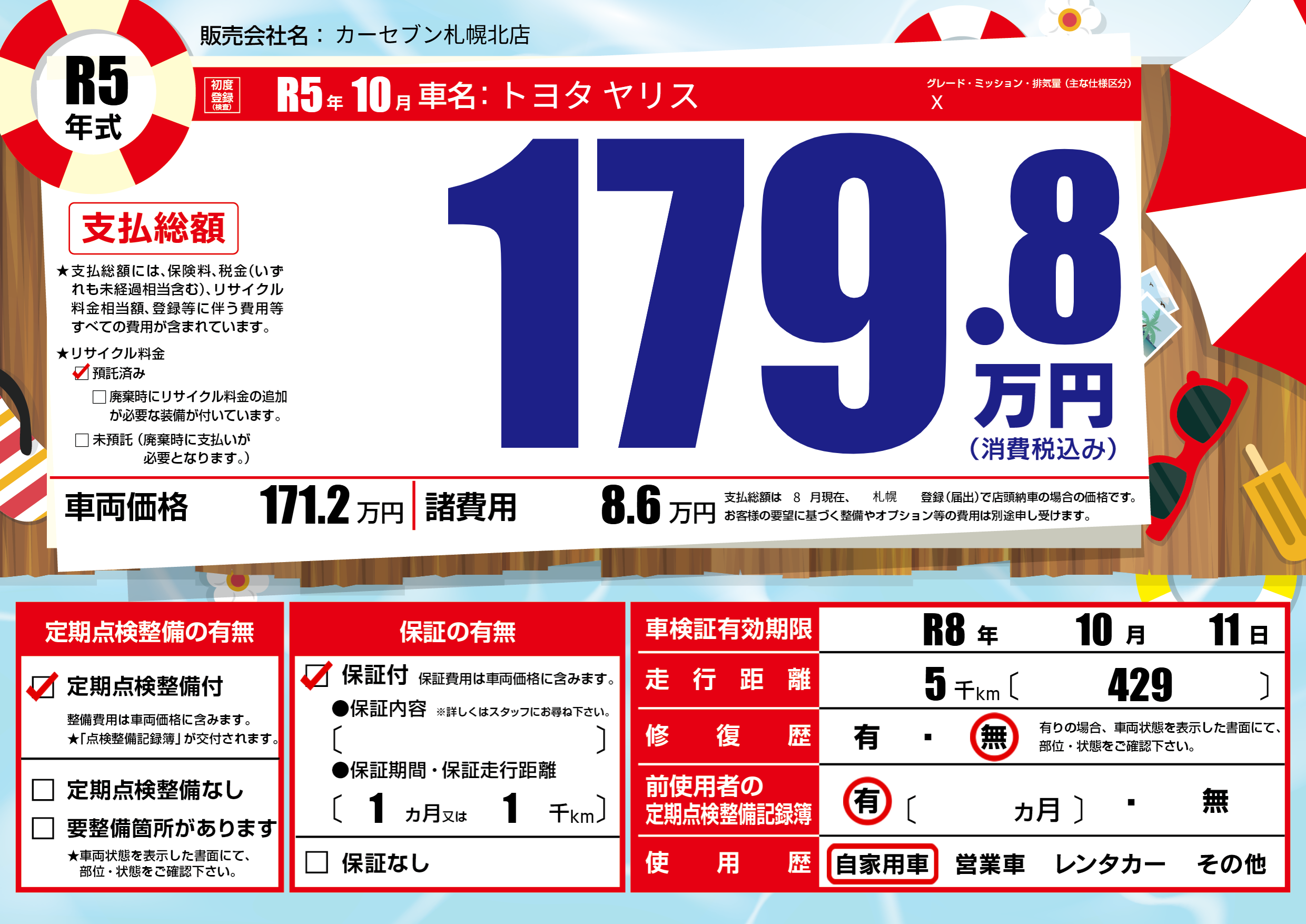 | 走行キロ | 0.5万km | 初年度登録 | R5年10月 |