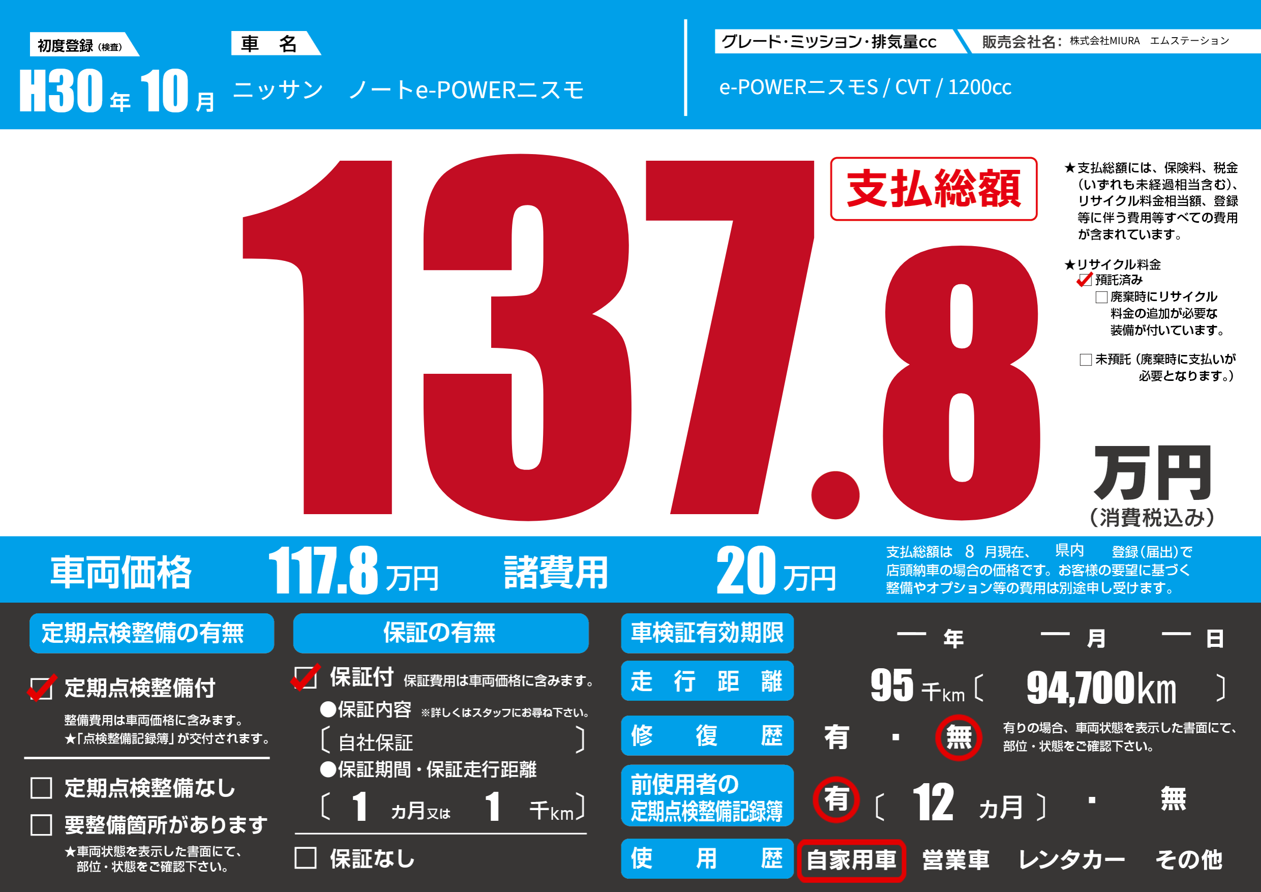 | 車名 | ニッサン ノートe-POWERニスモ | グレード ミッション 排気量 |