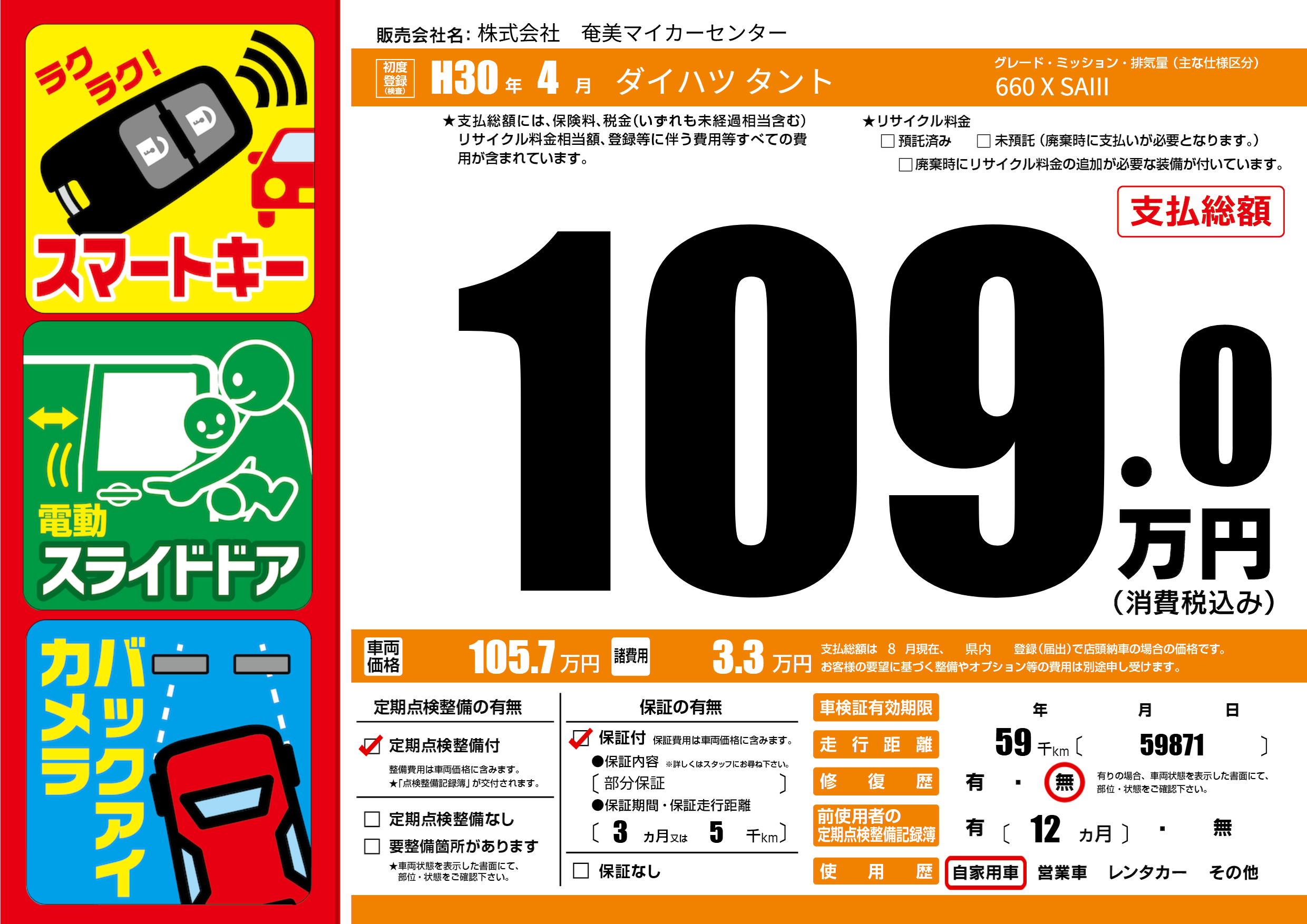 | 車名 | ダイハツ タント | グレード ミッション 排気量 |