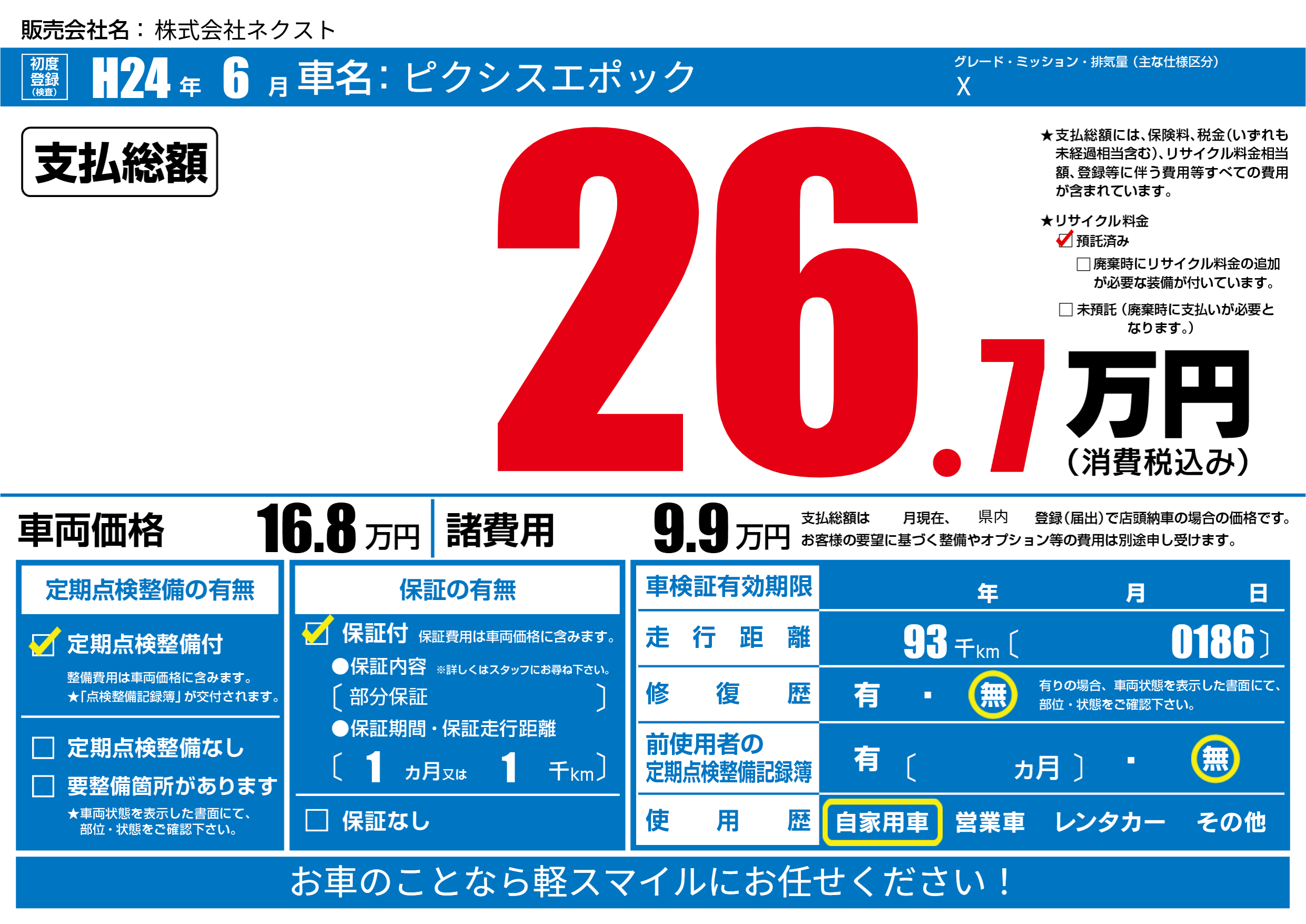 | 車名 | ピクシスエポック | グレード ミッション 排気量 |