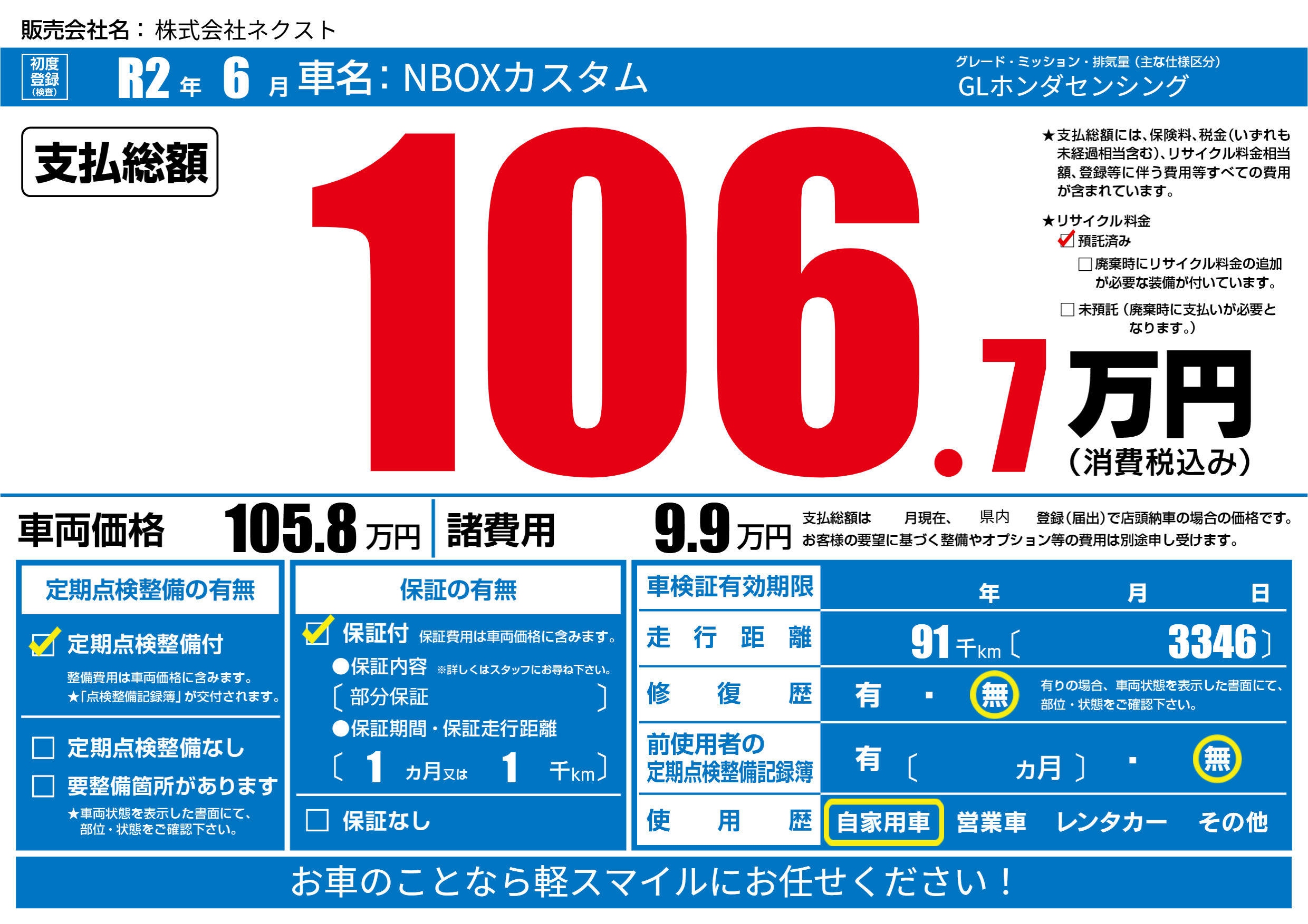| 走行キロ | 9.1万km | 初年度登録 | R2年6月 |