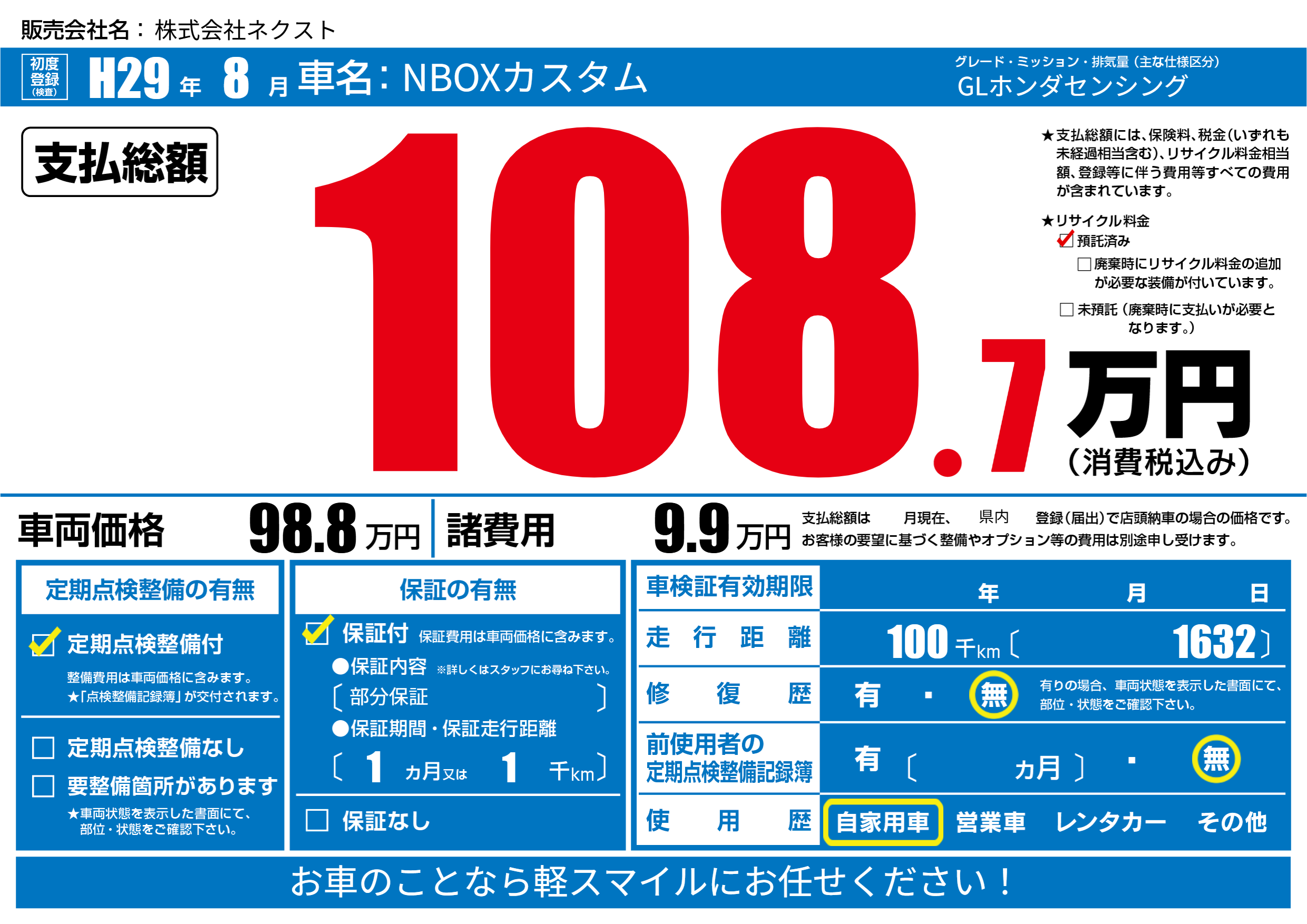 | 走行キロ | 10万km | 初年度登録 | H29年8月 |