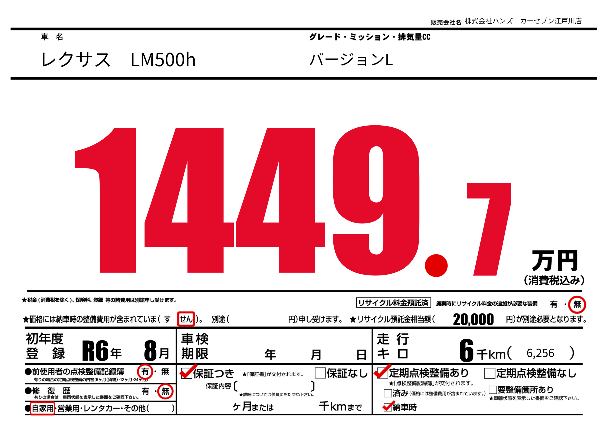 | 車名 | レクサス LM500h | グレード ミッション 排気量 |