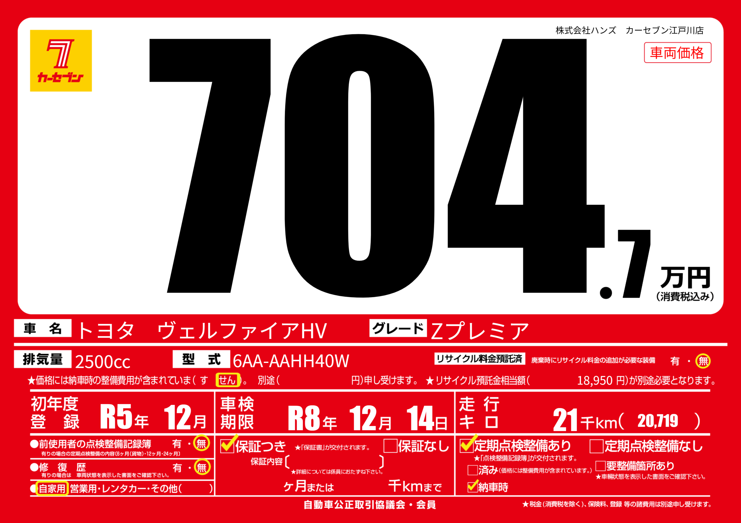 | 車名 | トヨタ ヴェルファイアHV | グレード ミッション 排気量 |