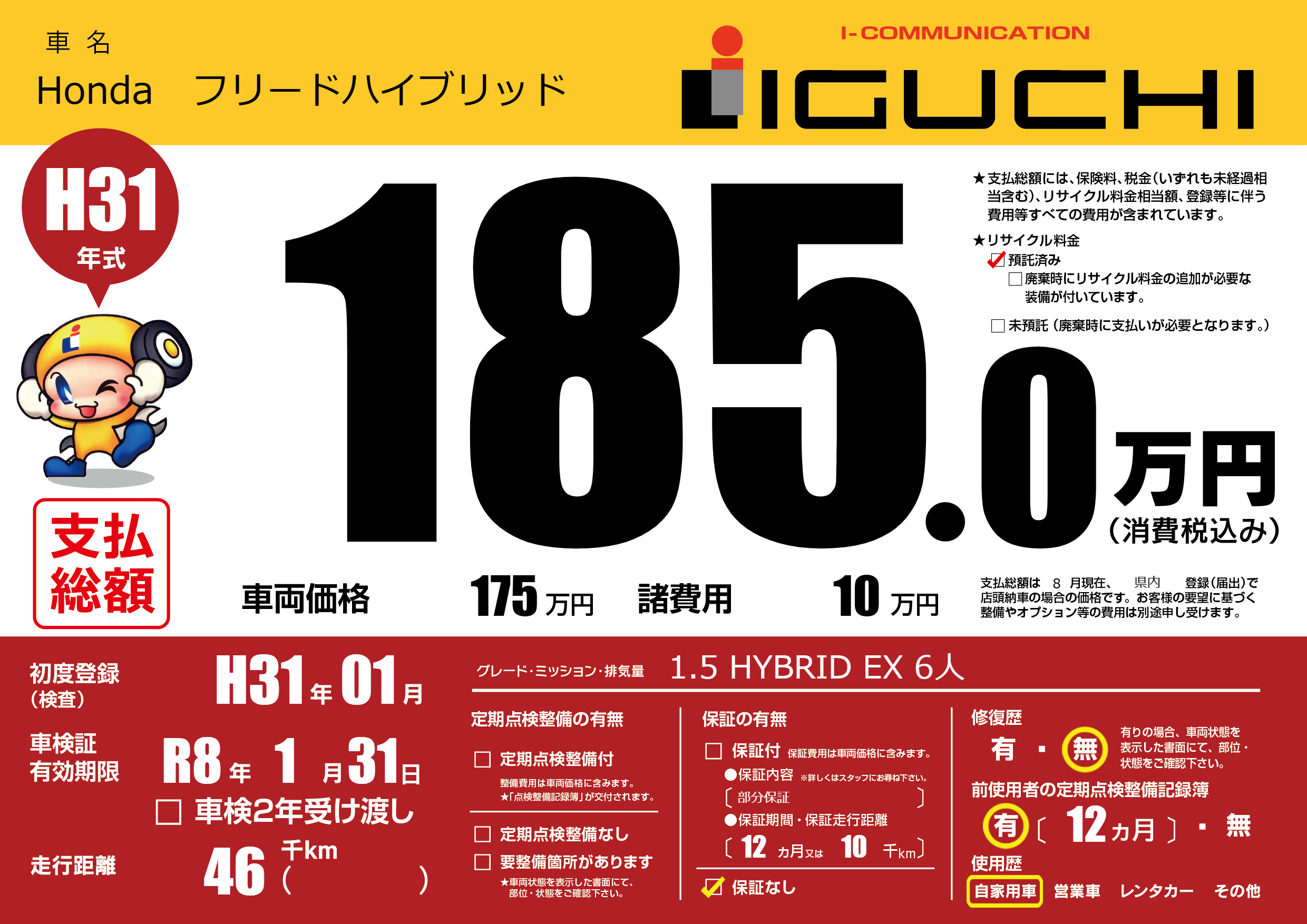 | 車名 | Honda フリードハイブリッド | グレード ミッション 排気量 |