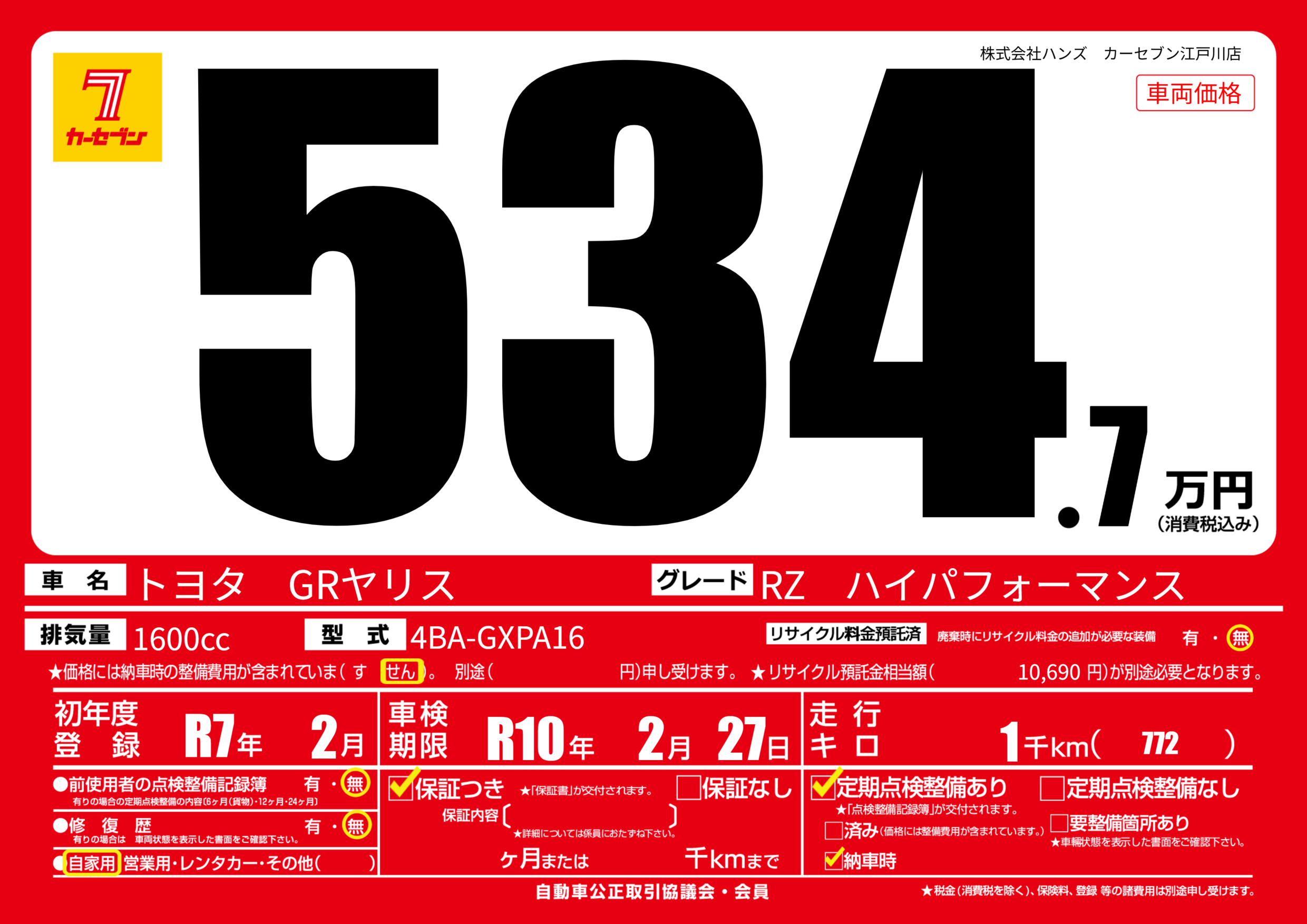 | 車検制限 | R10年 2月 27日 | ||