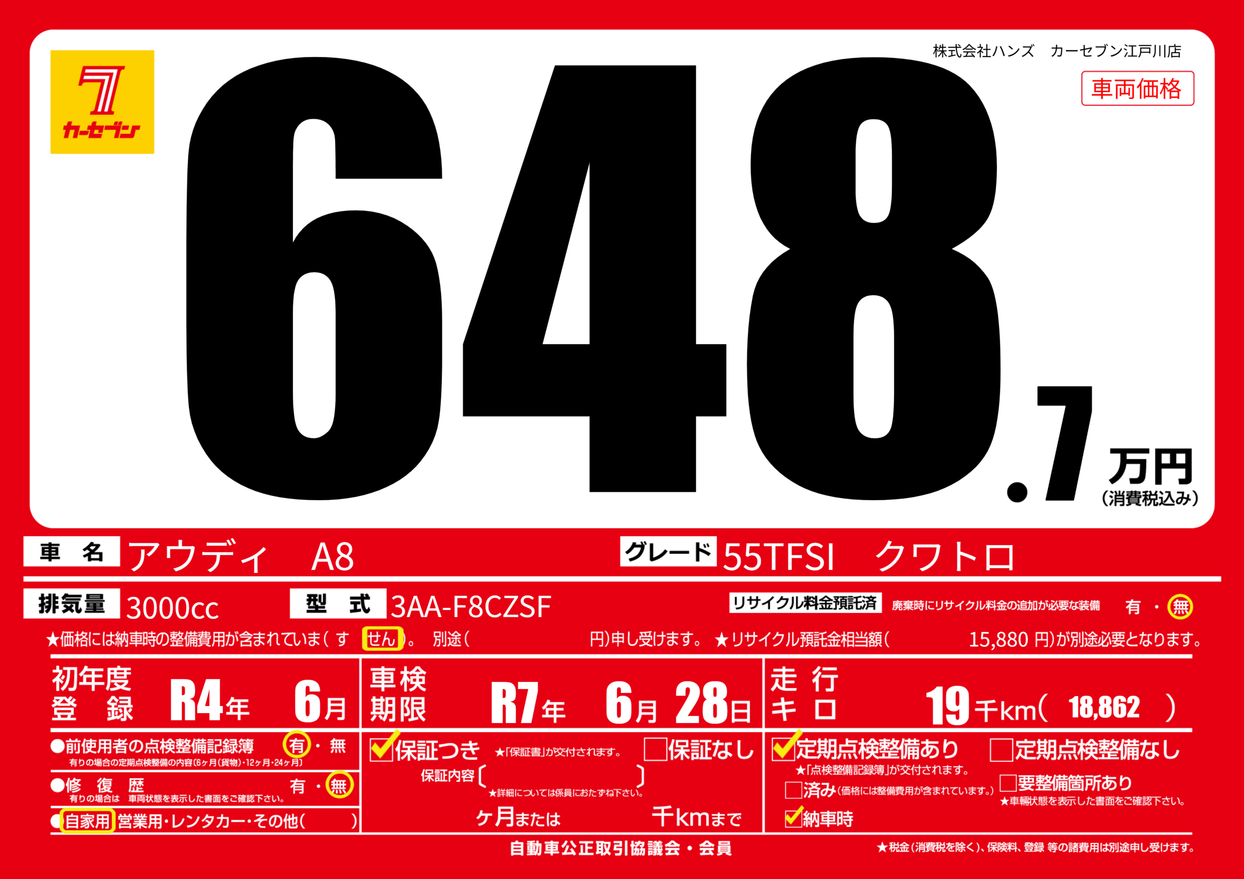 | 車名 | アウディ A8 | グレード ミッション 排気量 |