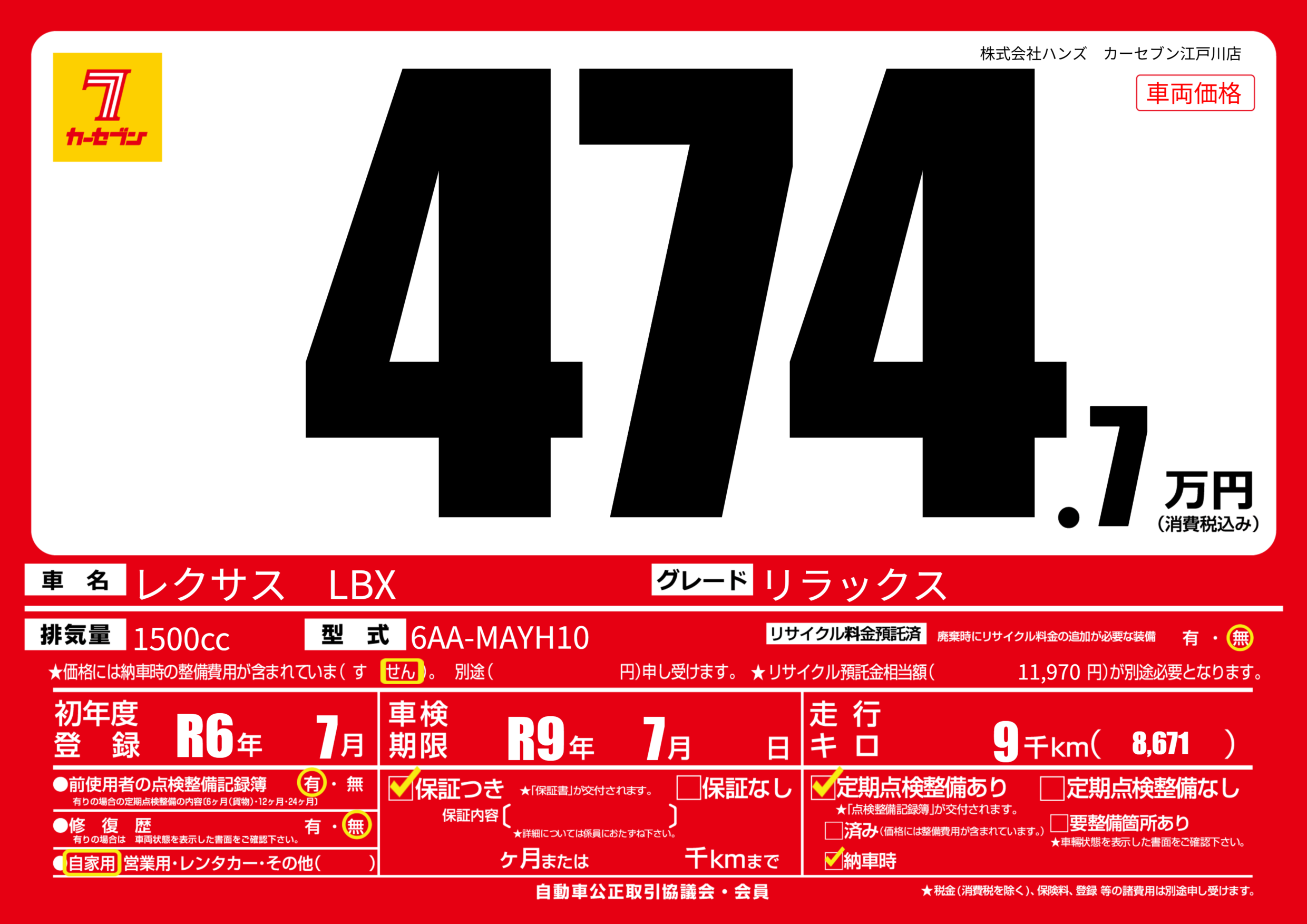 | 車名 | レクサス LBX | グレード ミッション 排気量 |