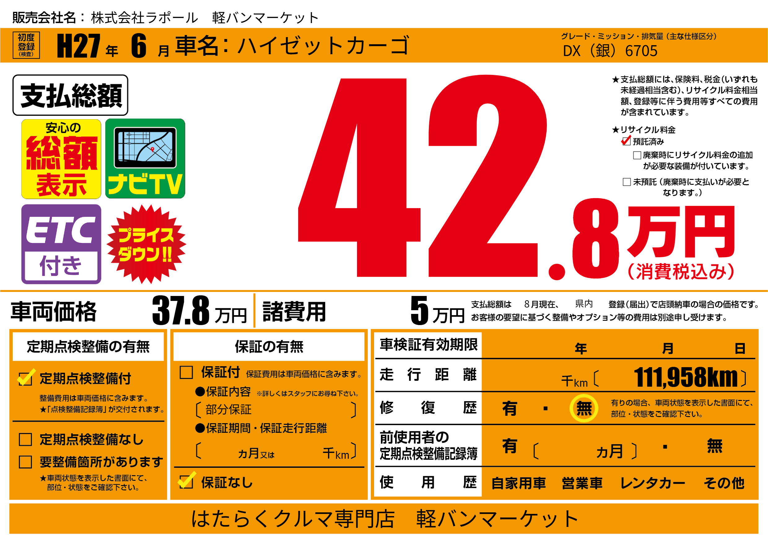 保証なし 保証内容(部分保証) ---ヶ月または()千kmまで |
