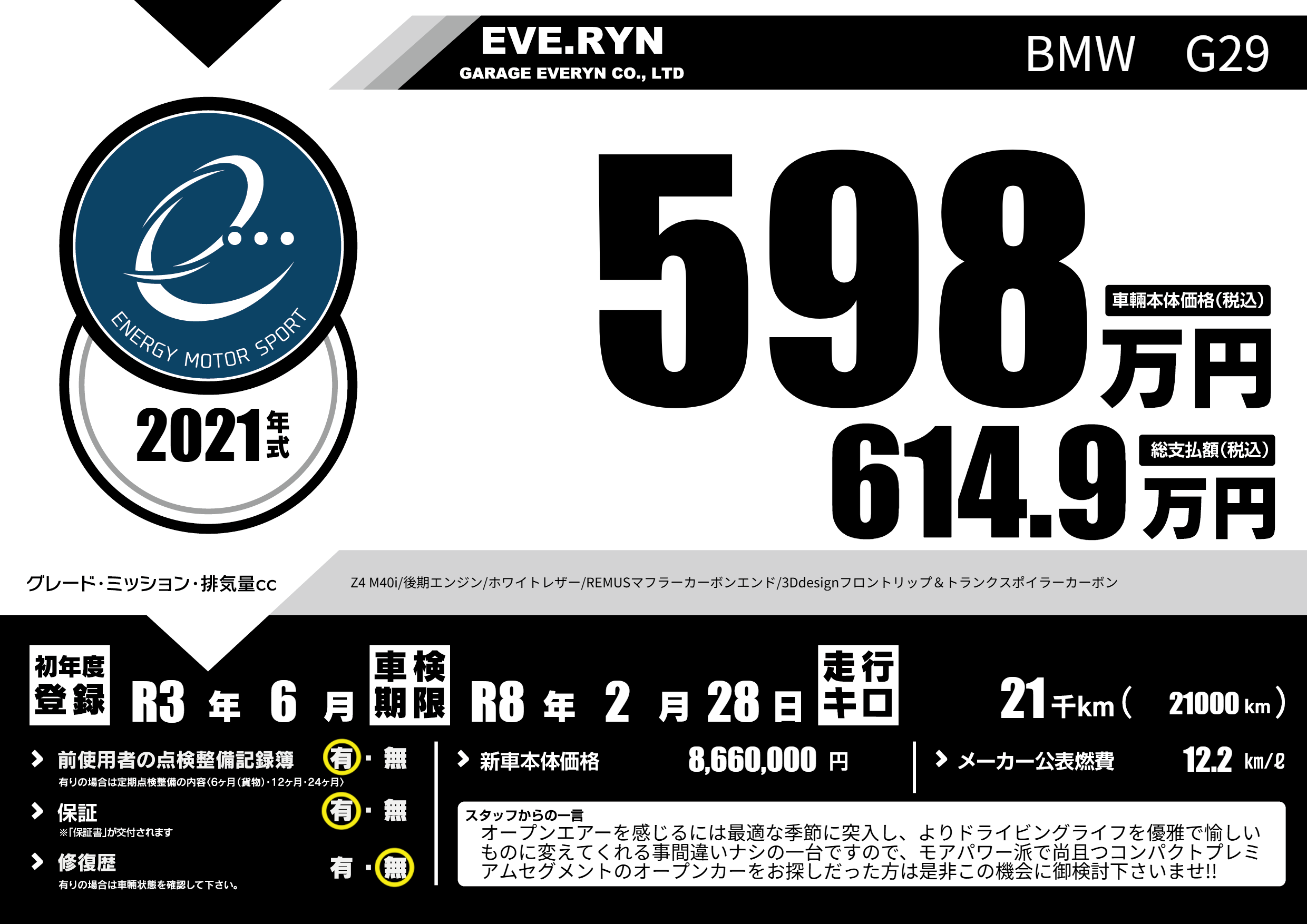 | 車名 | BMW G29 | グレード ミッション 排気量 |