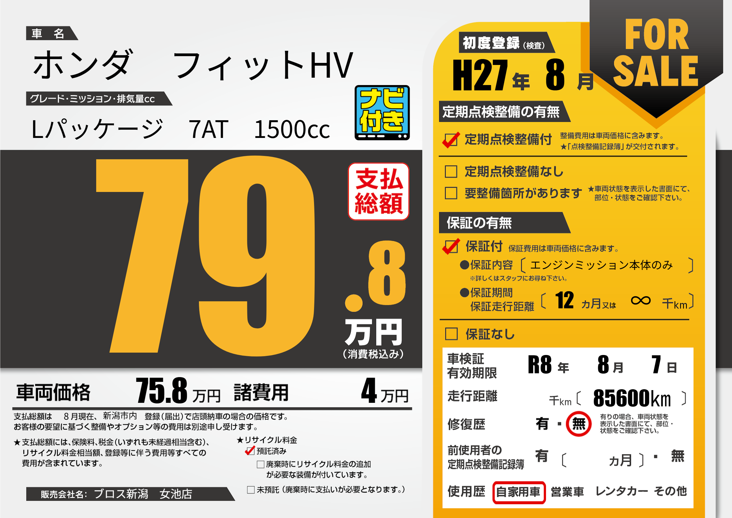 | 走行キロ | - | 初年度登録 | H27年8月 |